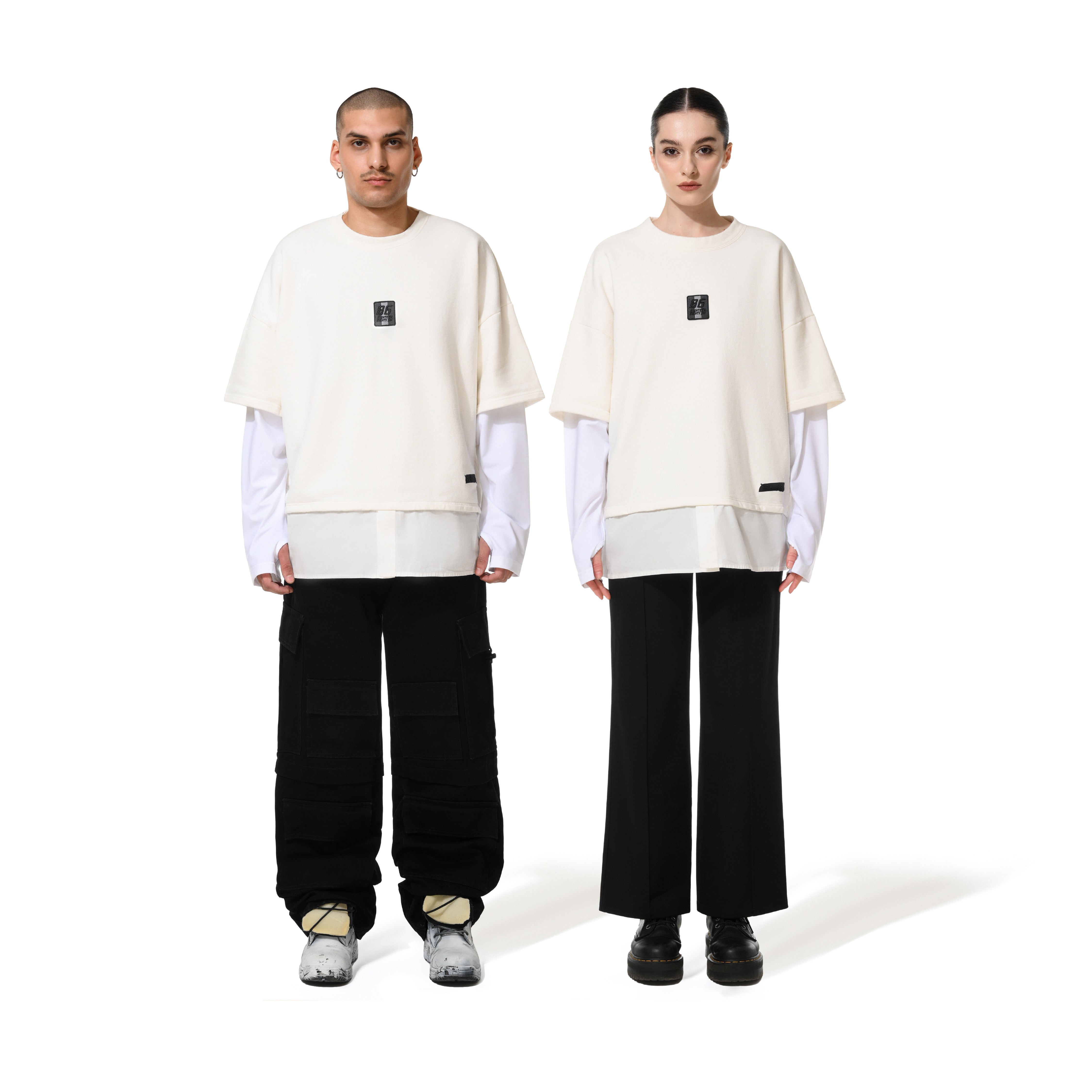 تي شيرت بأكمام طويلة بحجم كبير مع شعار ’86 مطرز على الجزء الأمامي. ياقة طاقم. اللون: أبيض مع أكمام بيضاء. القماش: القميص: قطن، الأكمام: نايلون.