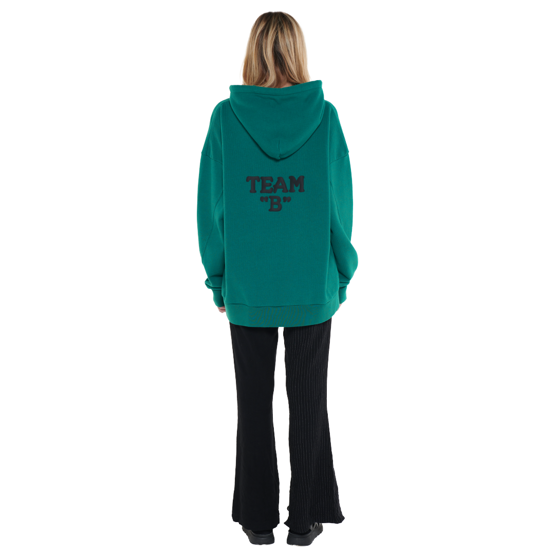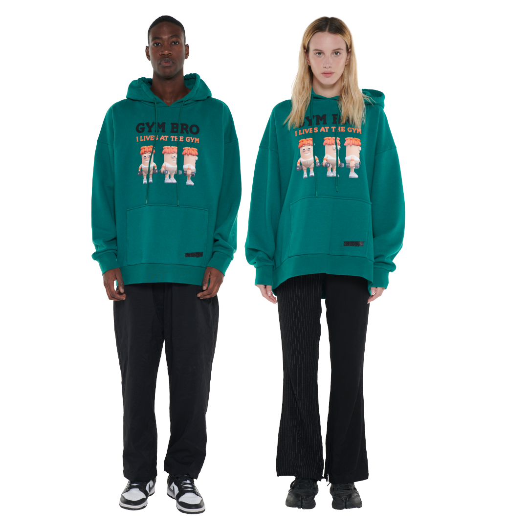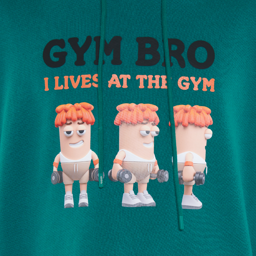 هودي كبير الحجم مع "Gym bro; I lives at the gym" مطبوعة على الجهة الأمامية و "فريق ب" جرافيك مطبوعة على الجهة الأمامية. اللون: أخضر. النسيج: قطن 100٪