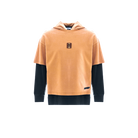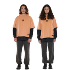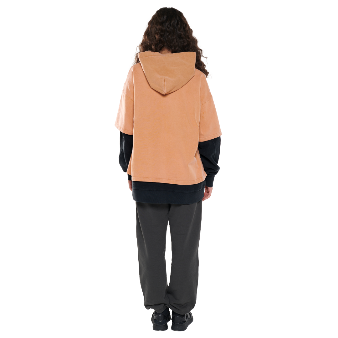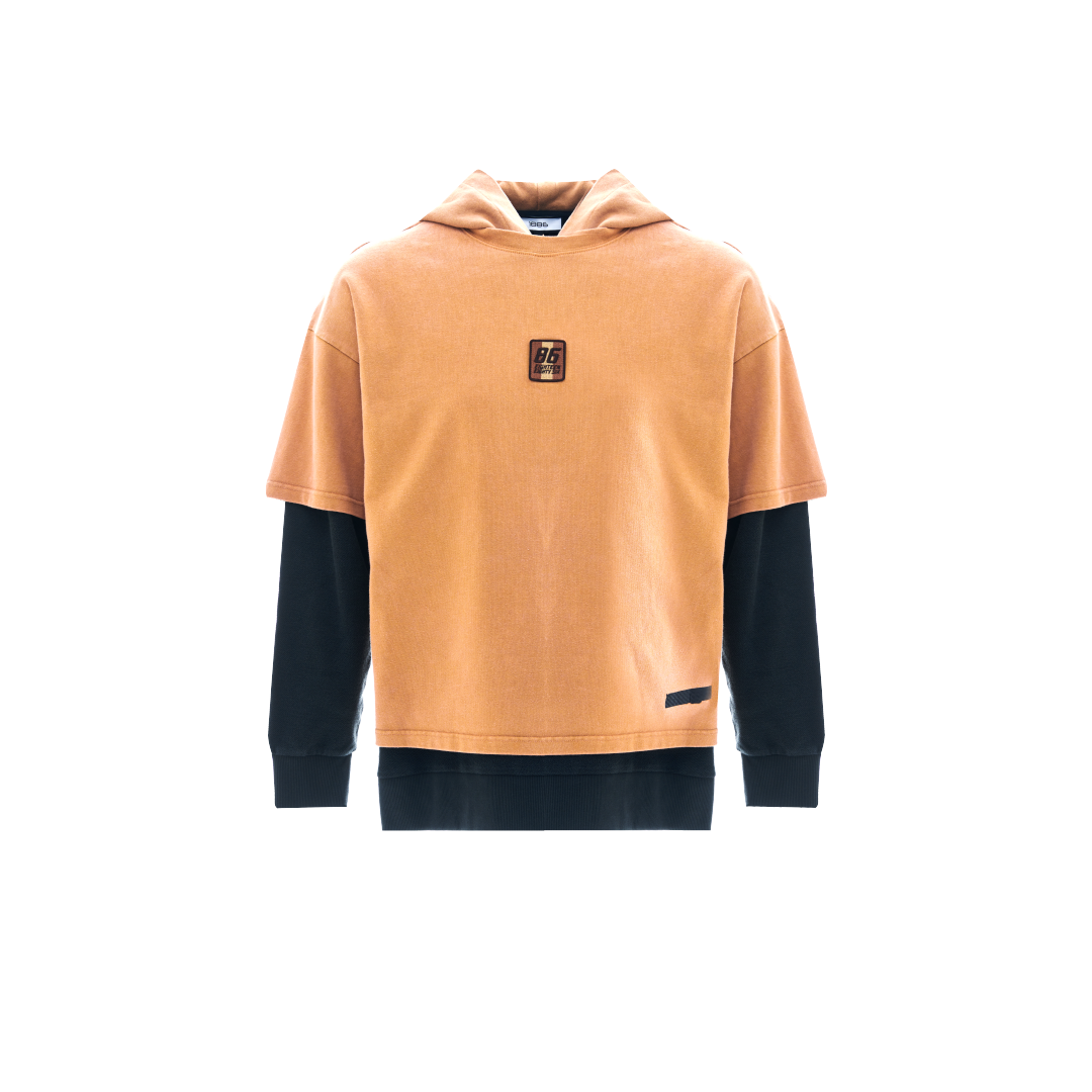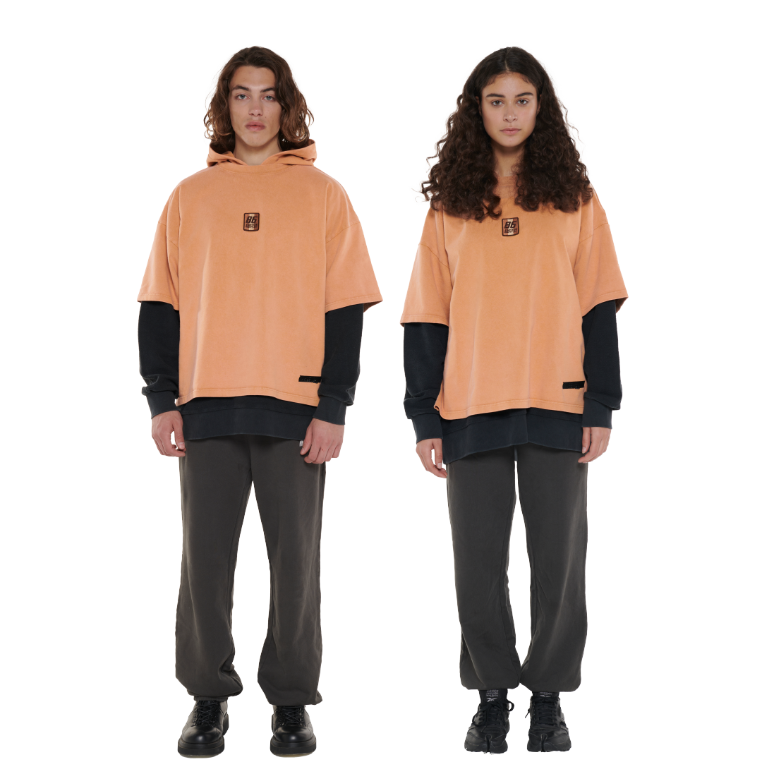 هودي مزدوج بحجم كبير بأكمام طويلة مع شعار ’86 مطرز على الجزء الأمامي. اللون: بني مغسول مع أكمام سوداء. القماش: قطن 100٪