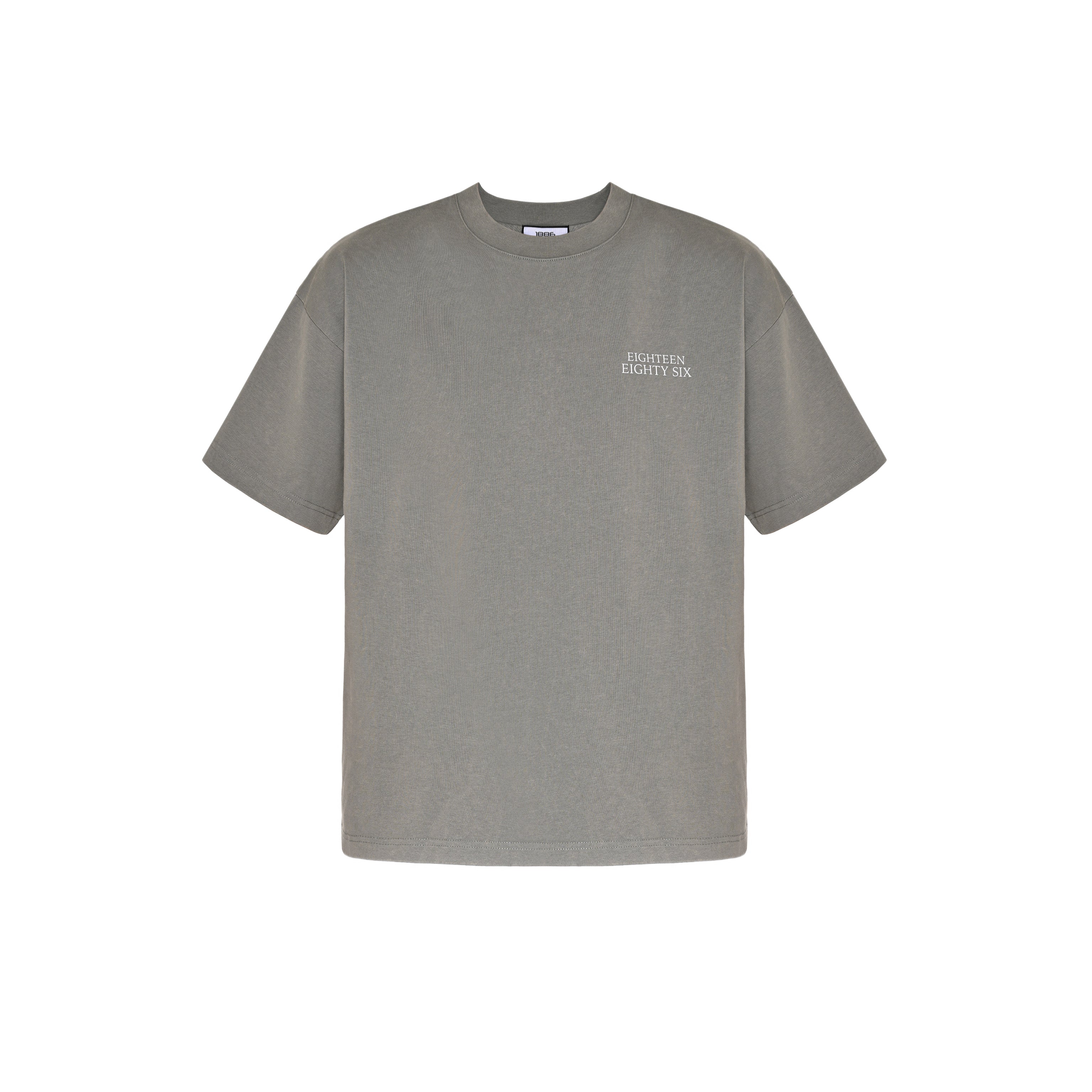تيشيرت رمادي بأكمام قصيرة وكبير الحجم مطبوع عليه