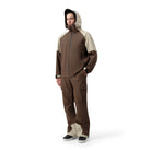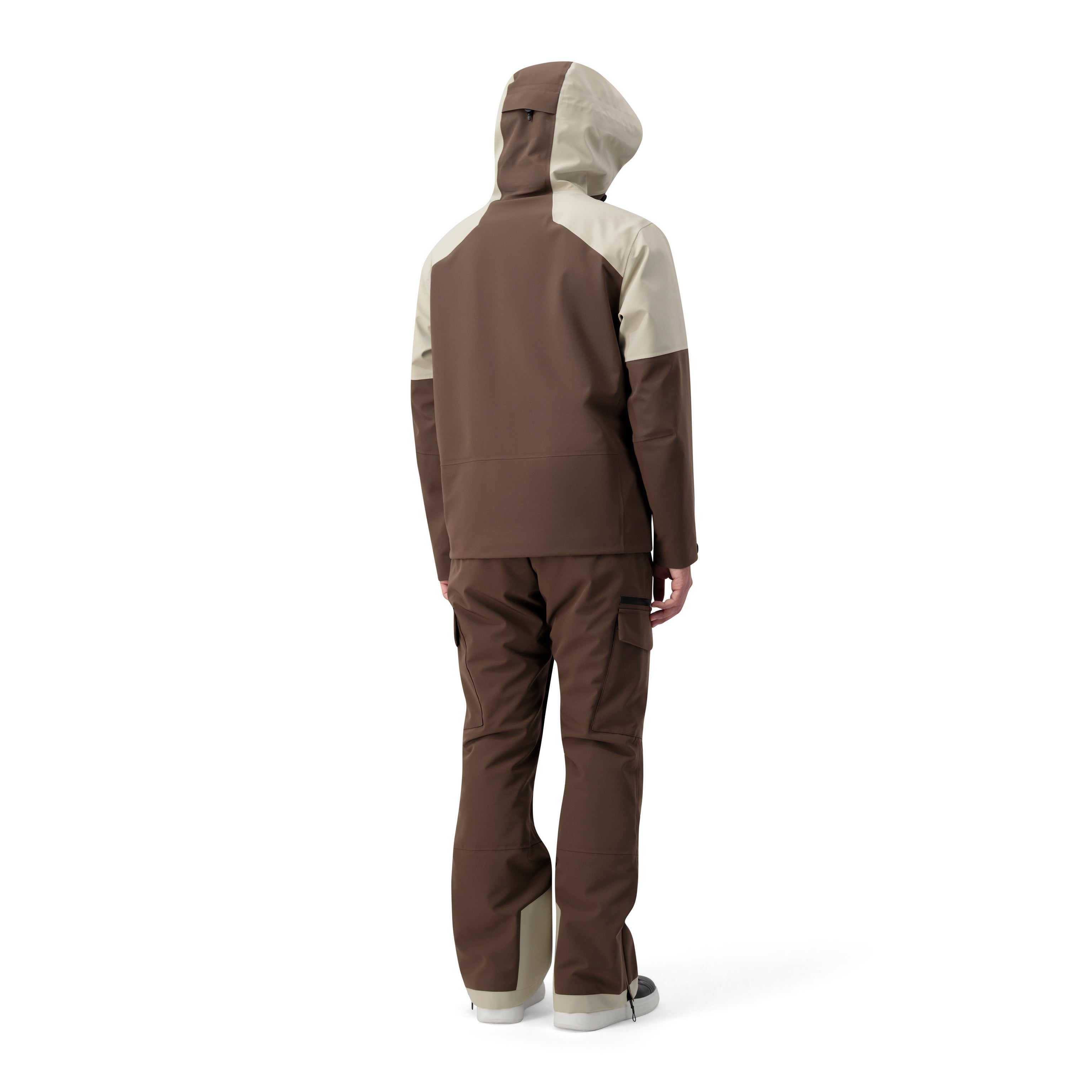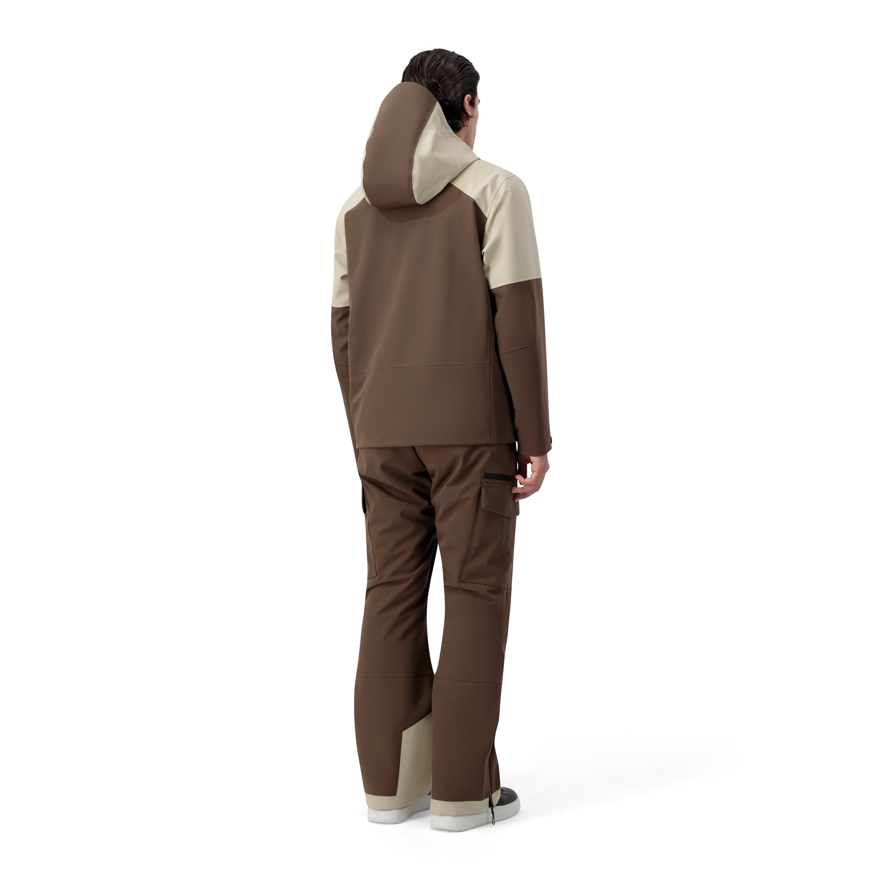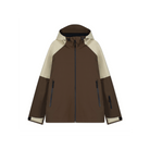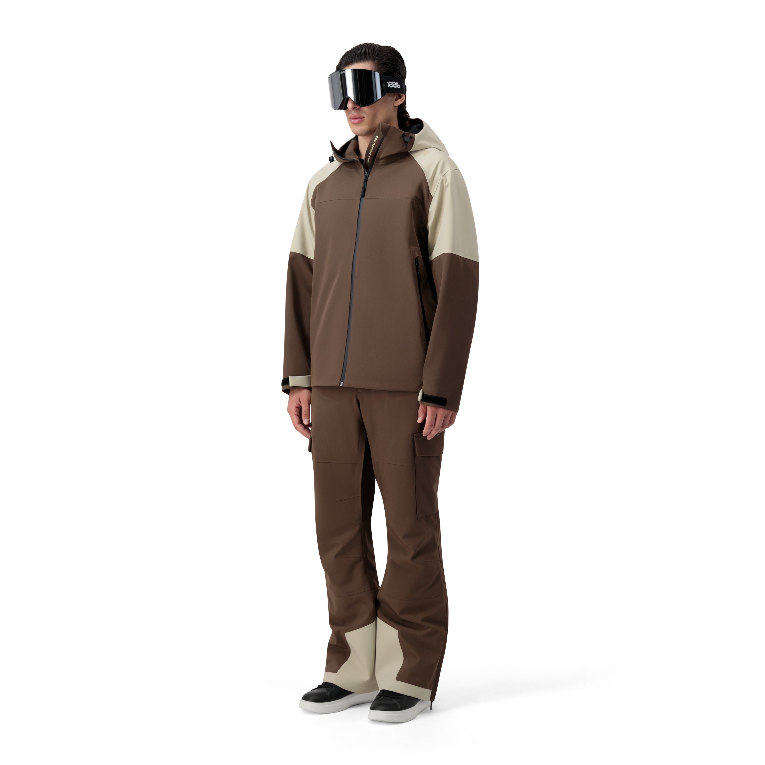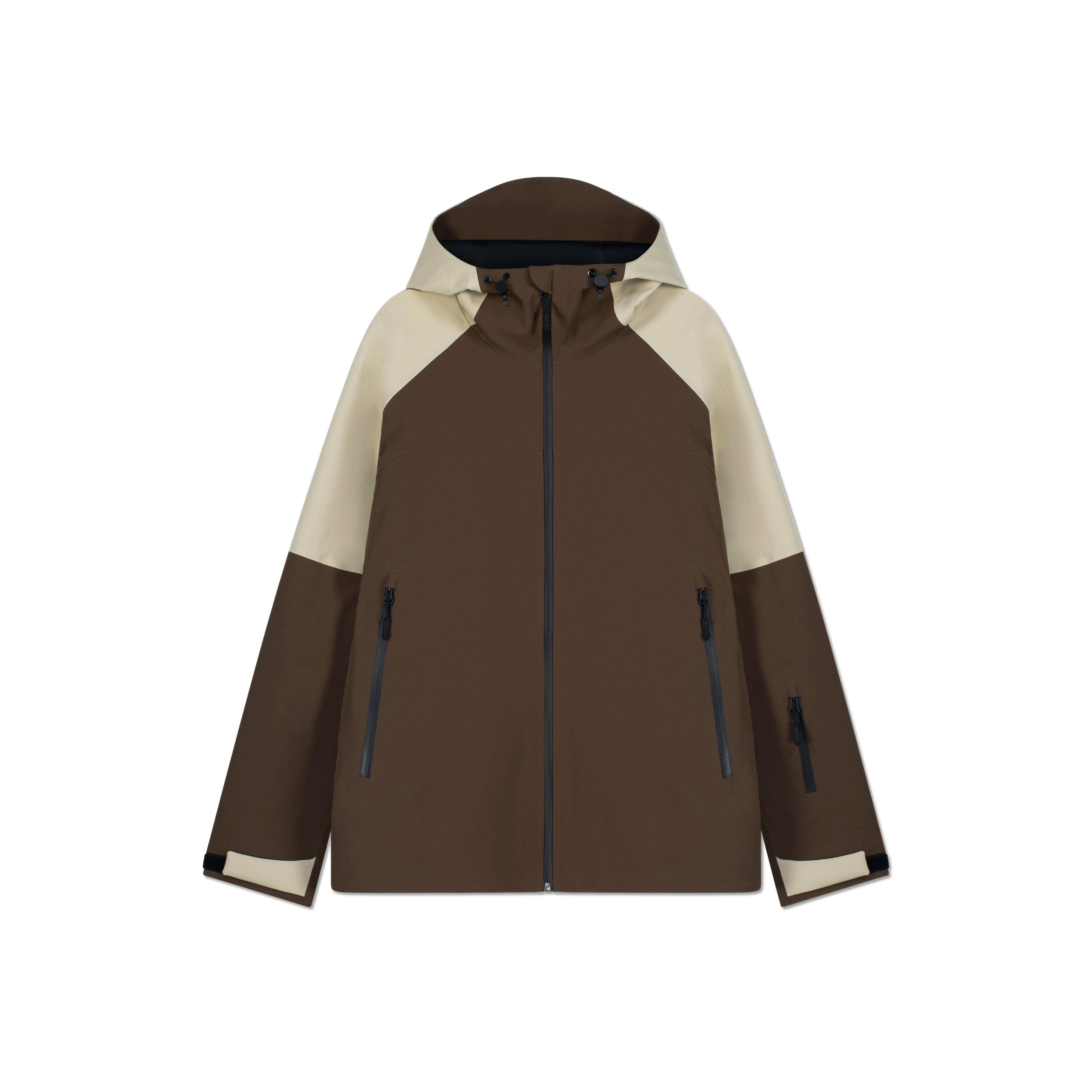 Crafted with a modern, architectural silhouette, this hooded jacket features a sophisticated color-block design that balances earthy elegance with technical edge. The structured hood with adjustable drawstrings offers both functionality and refinement. A full-length waterproof front zipper is complemented by two discreet vertical zip pockets for a sleek, streamlined look. Raglan sleeves enhance comfort and mobility, while adjustable cuffs allow for a tailored fit.