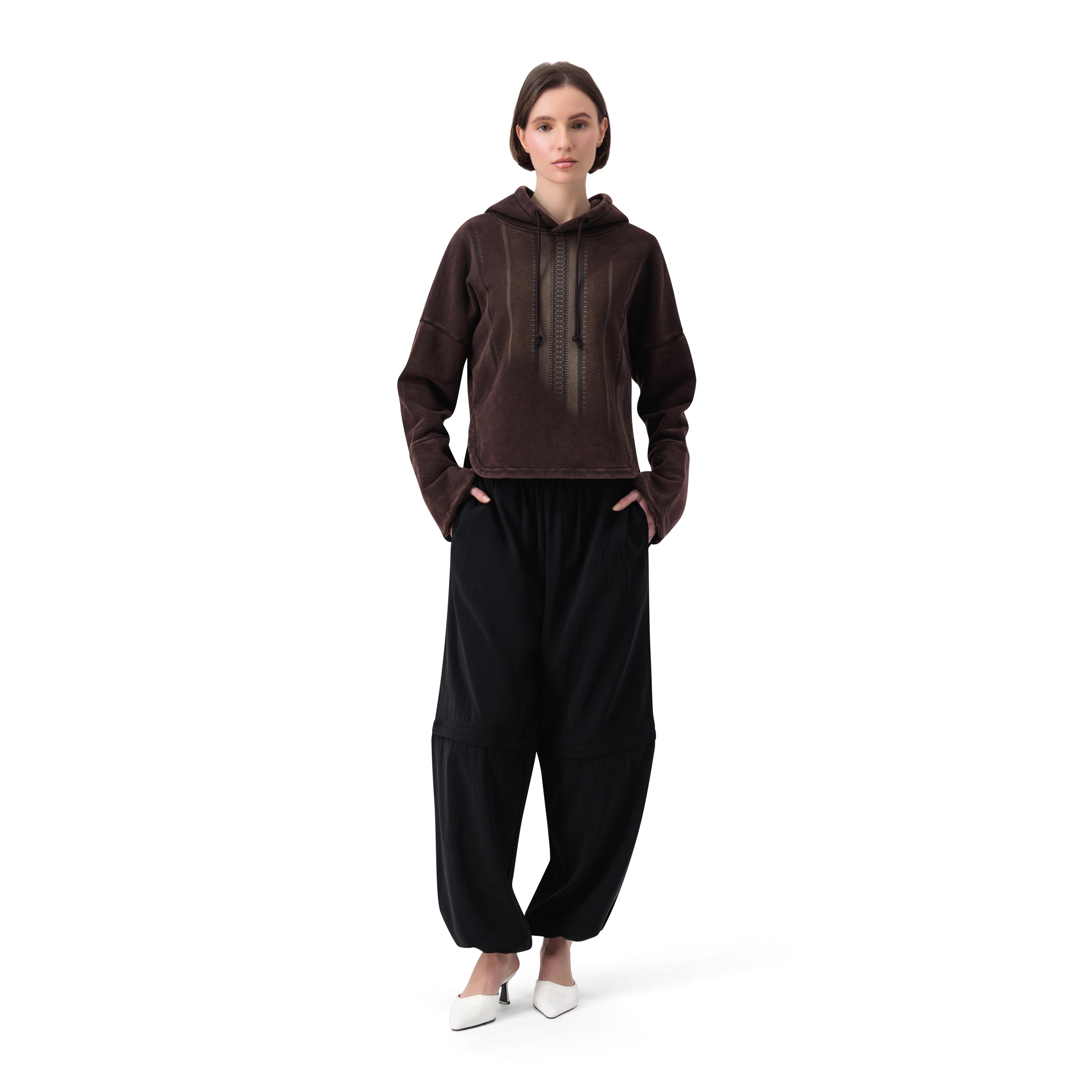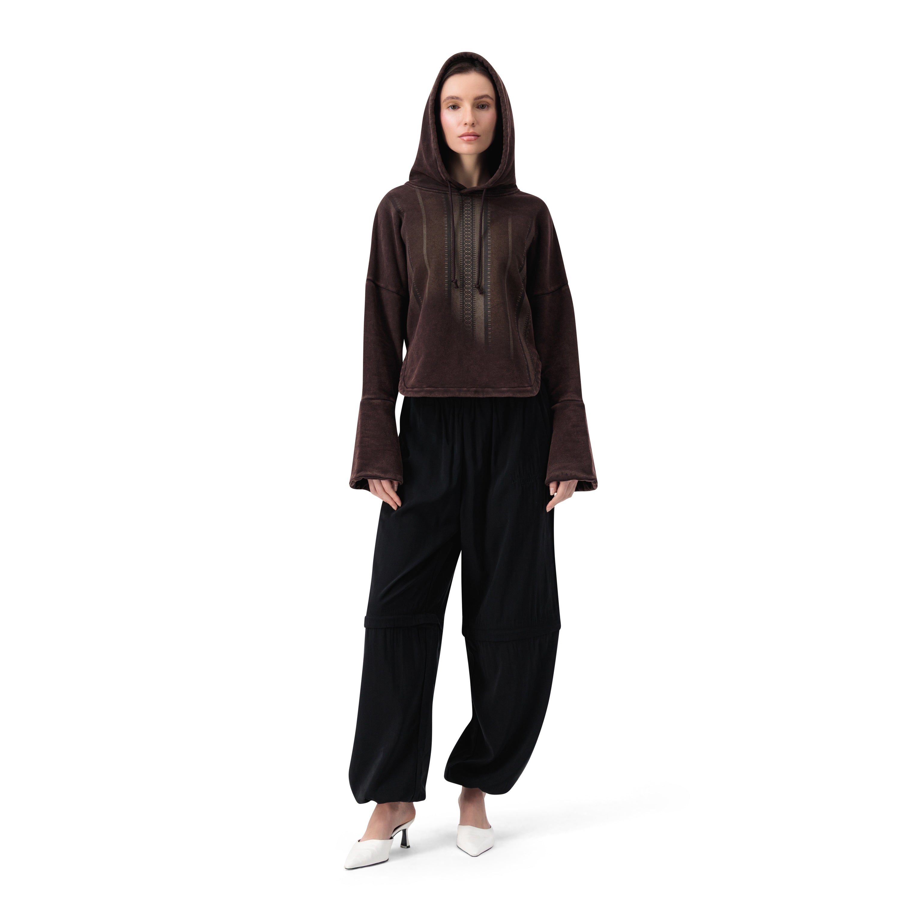 هودي كبير الحجم بأكمام طويلة مع طباعة خطوط جرافيكية في الأمام. حواف مضلعة عند الأصفاد والحافة.