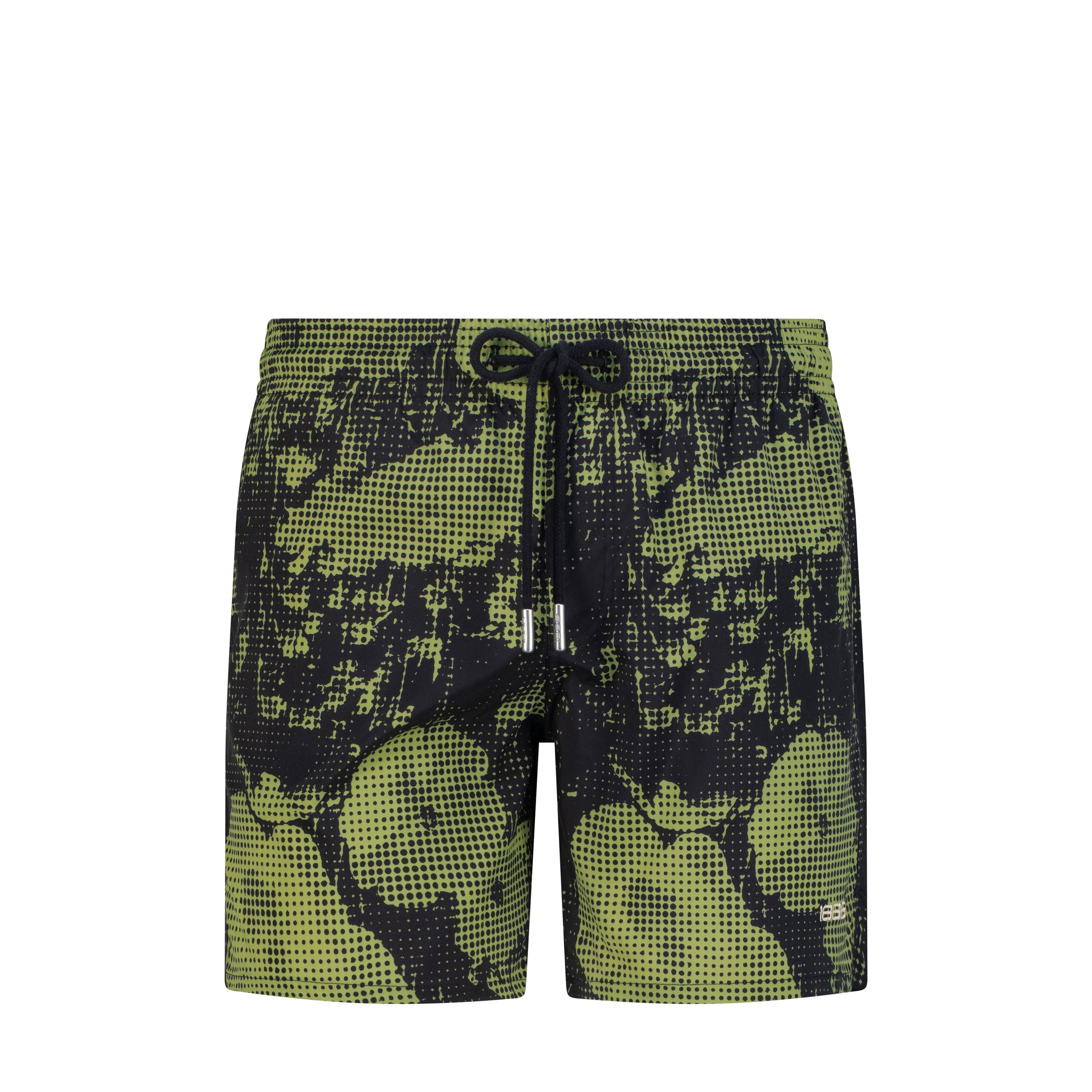 A bold, abstract graphic print brings an artistic edge to classic swimwear, blending a contemporary pixelated motif with organic, wave-like forms. The elasticated waistband is finished with a refined drawstring closure, featuring sleek metal-tipped cords for a polished touch. Clean tailoring and minimal branding keep the look effortlessly sophisticated.