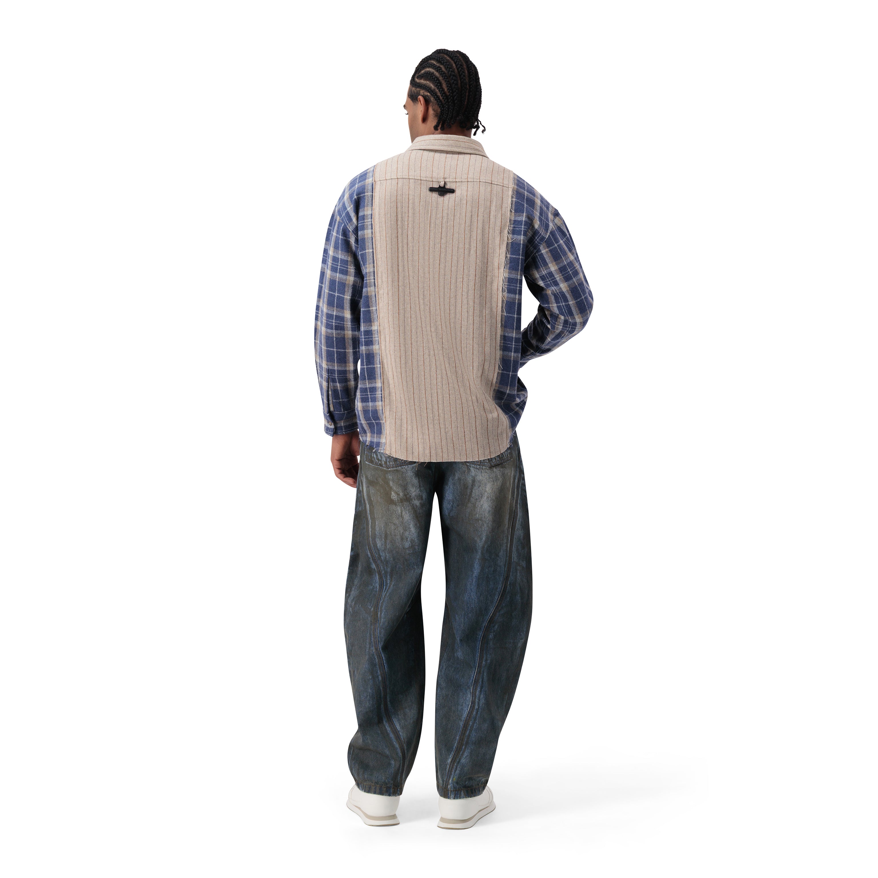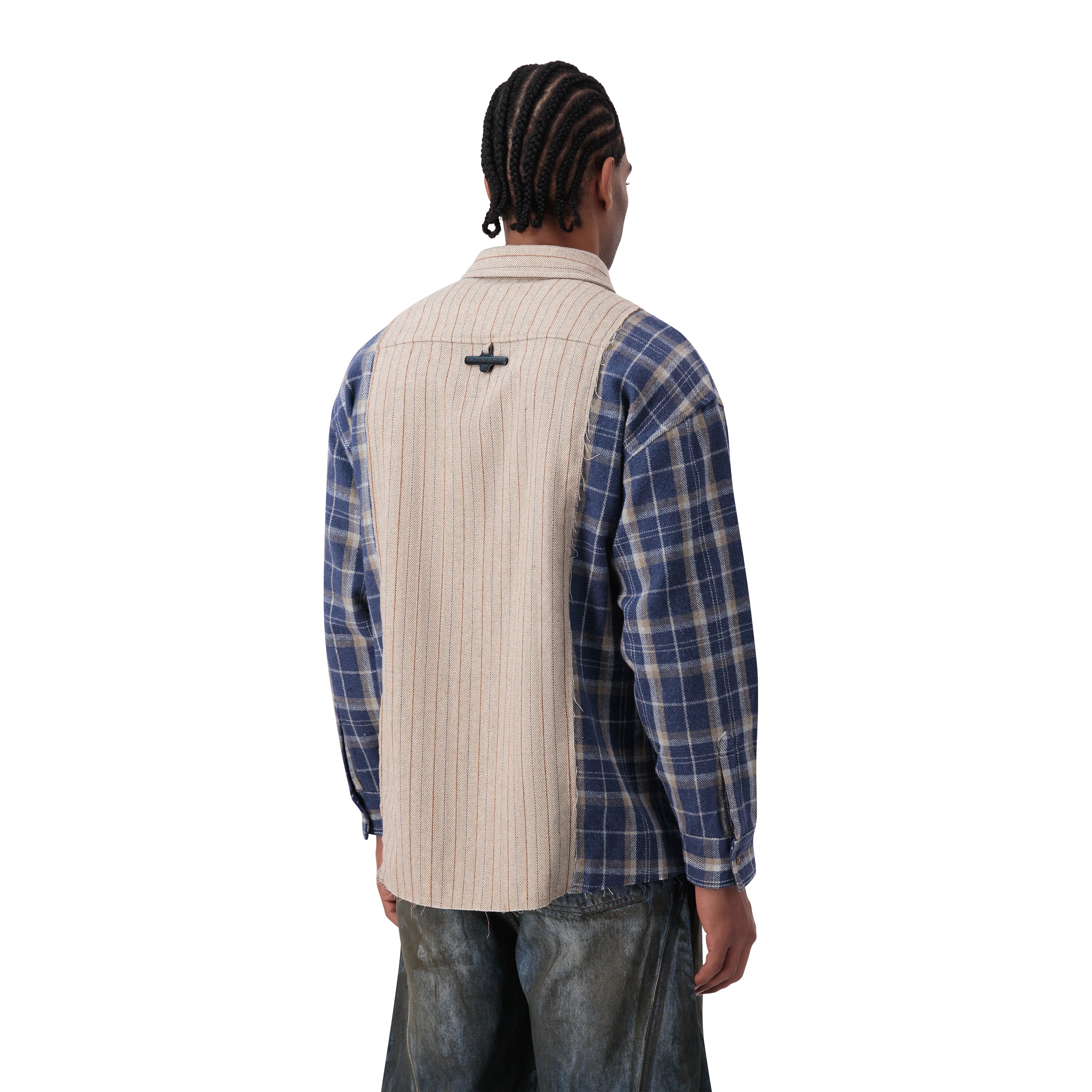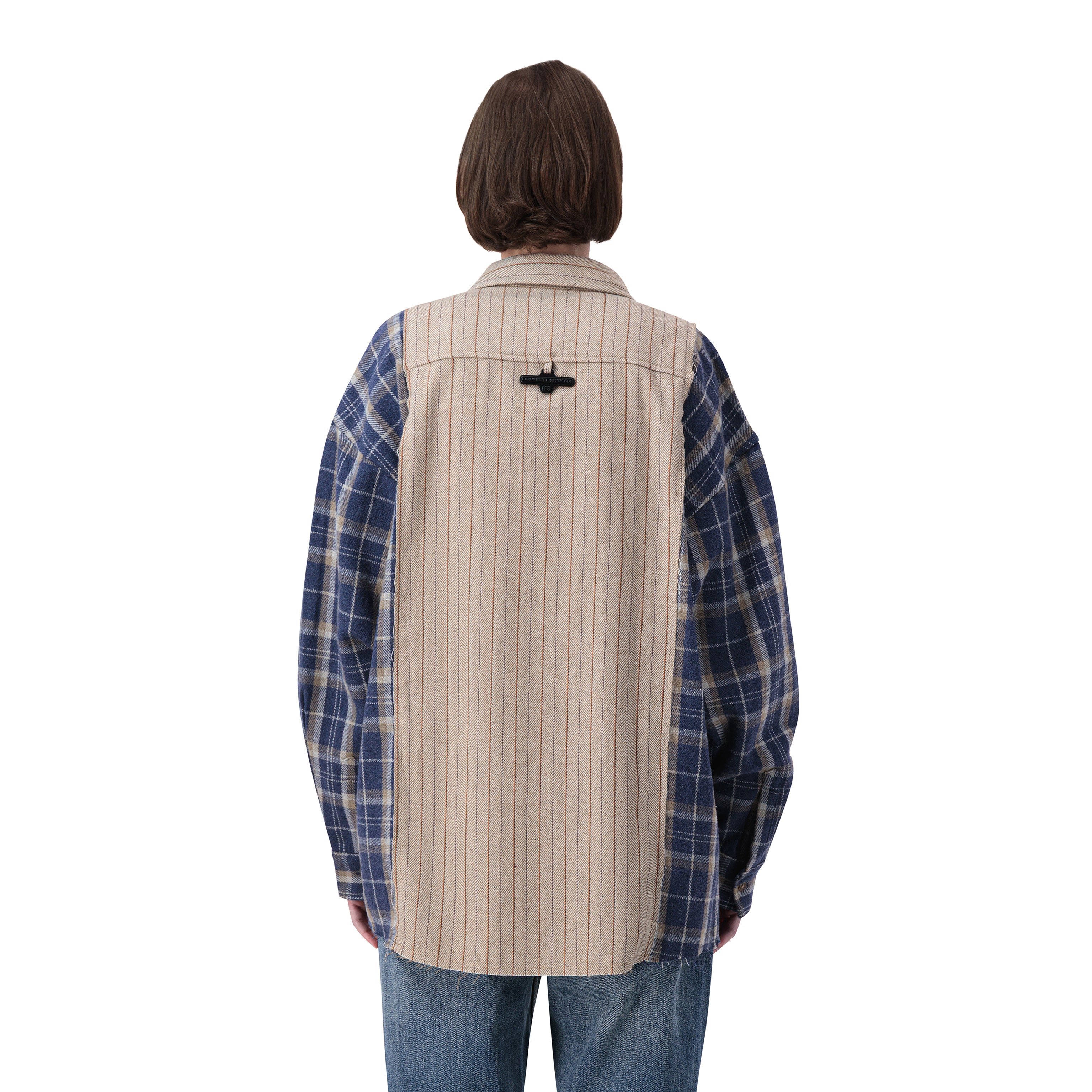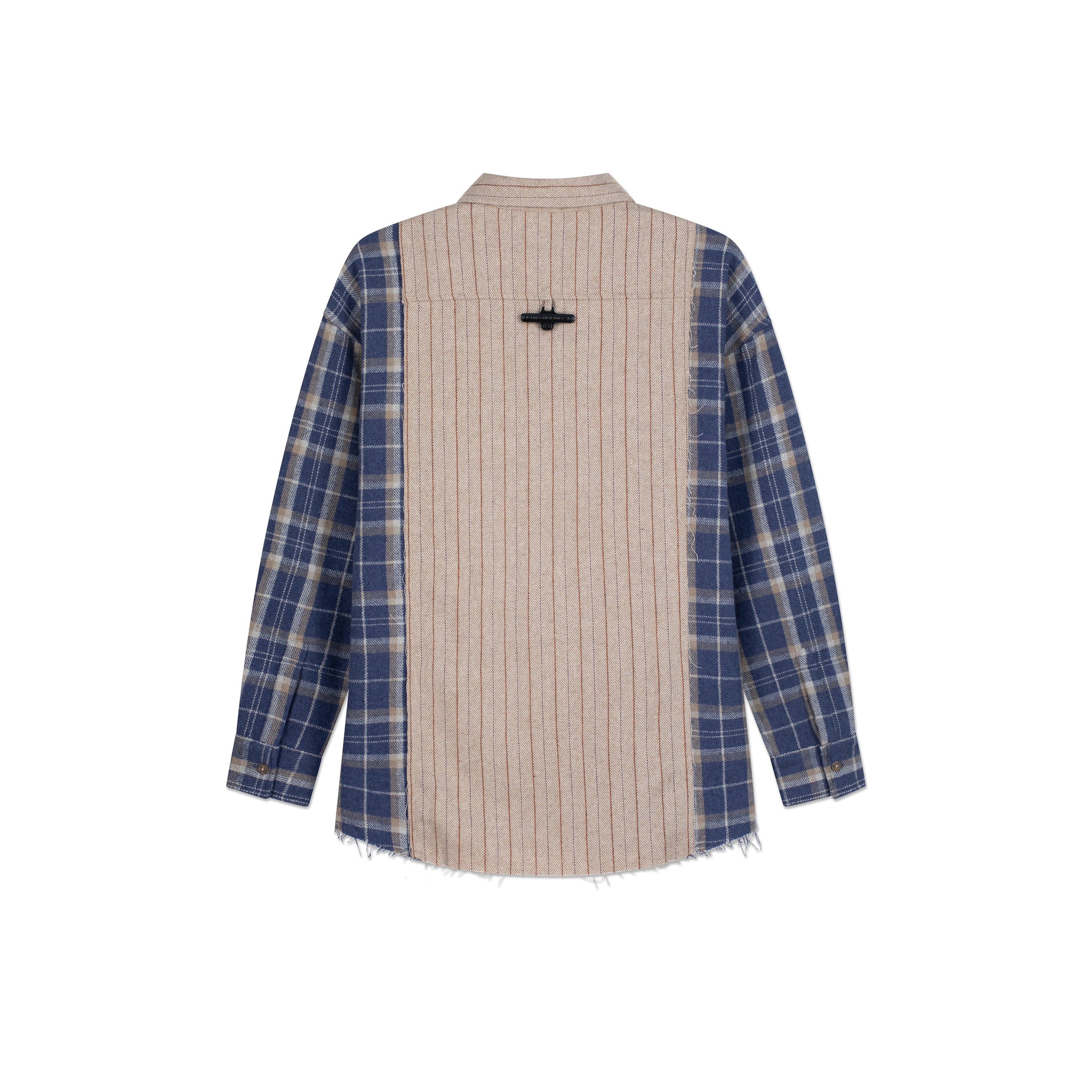 قميص بتصميم مربعات بأكمام طويلة باللون البيج والأزرق، كبير المقاس، شعار من الفولاذ على الظهر. ياقة كلاسيكية