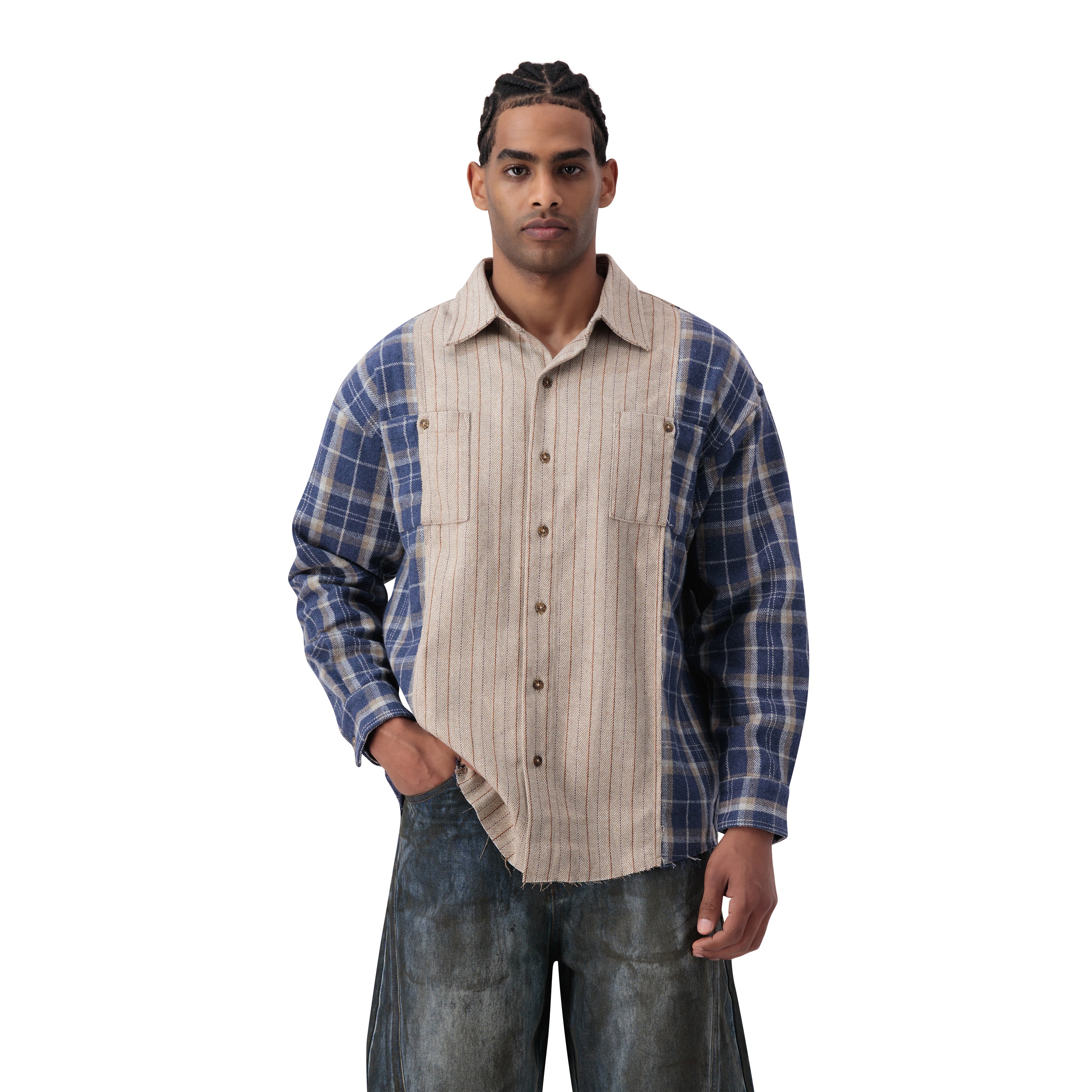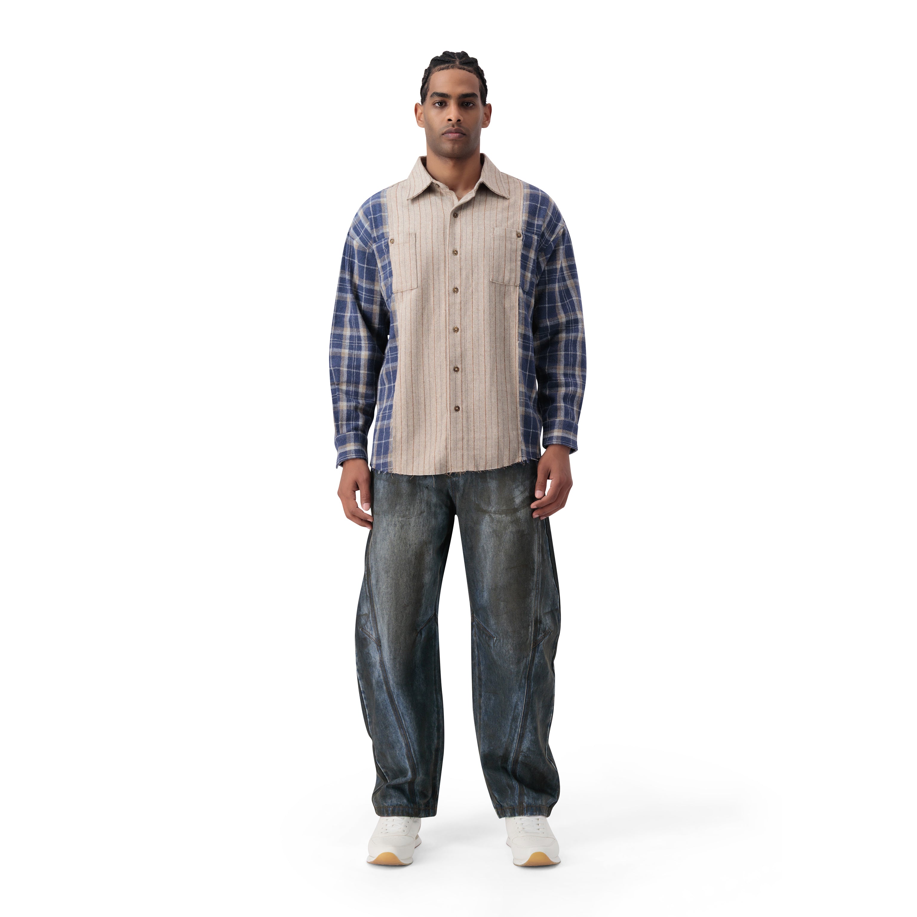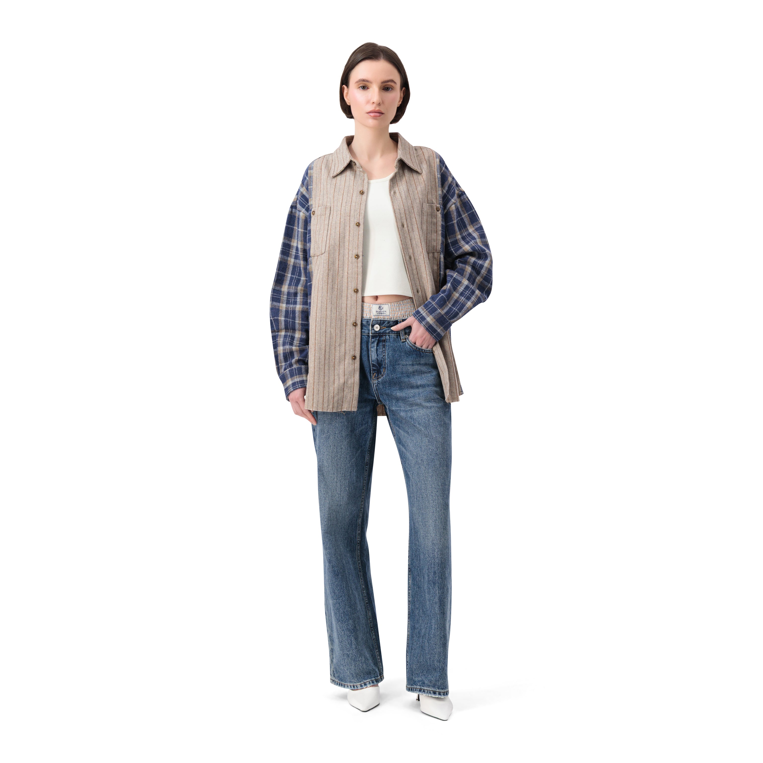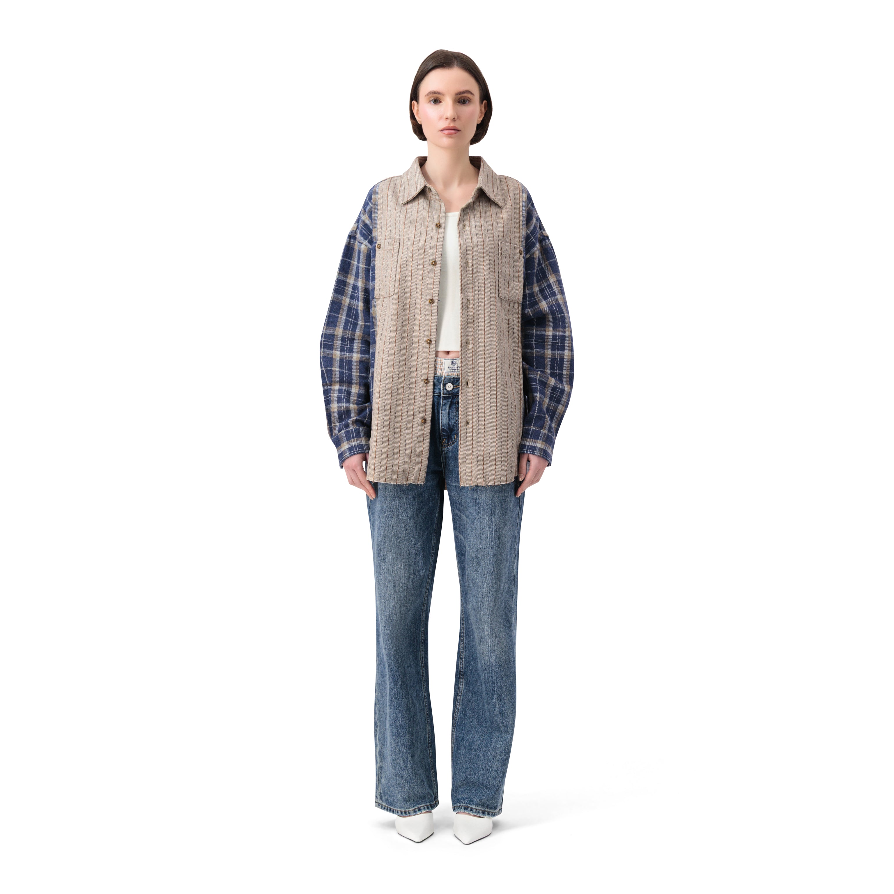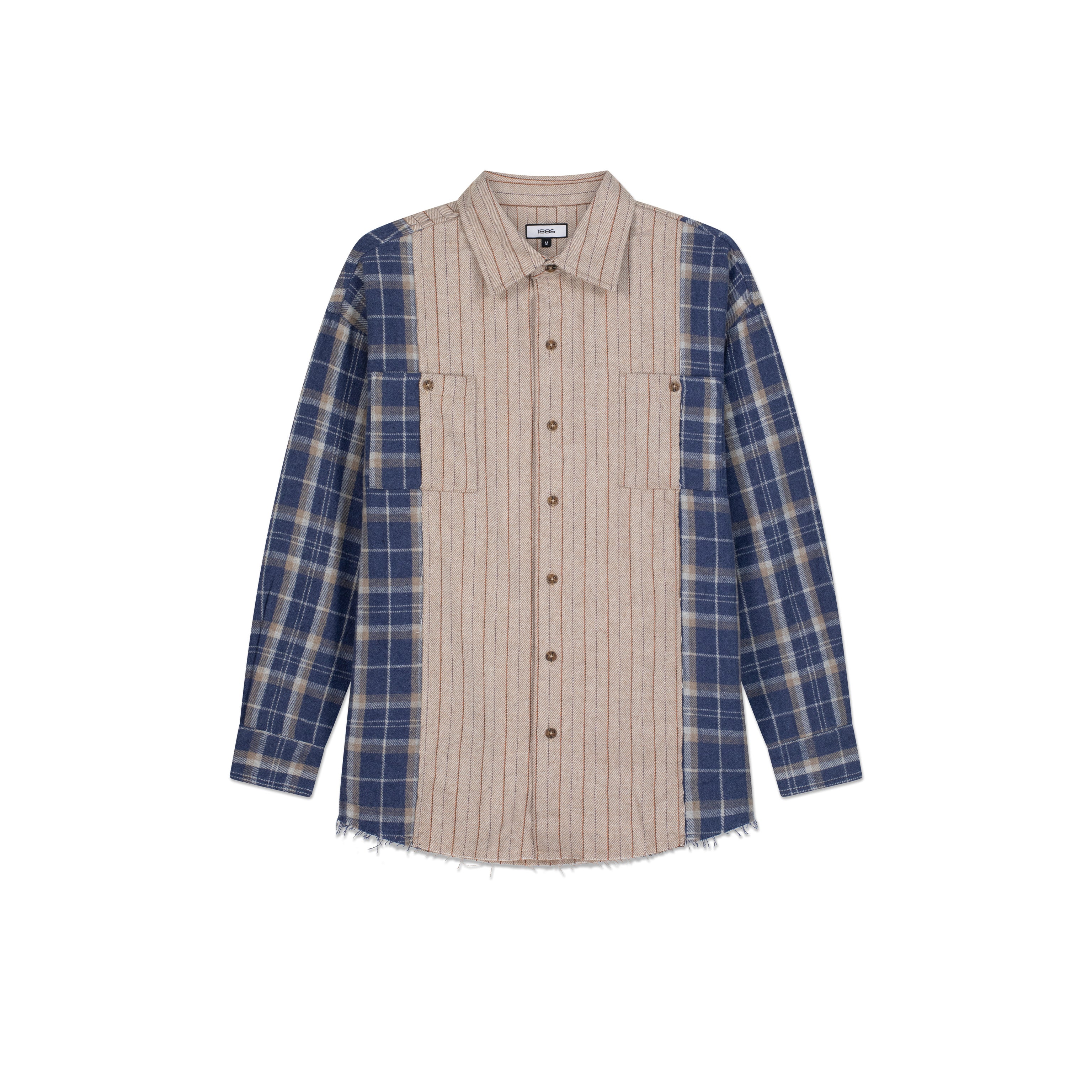 قميص بتصميم مربعات بأكمام طويلة باللون البيج والأزرق، كبير المقاس، شعار من الفولاذ على الظهر. ياقة كلاسيكية
