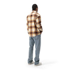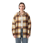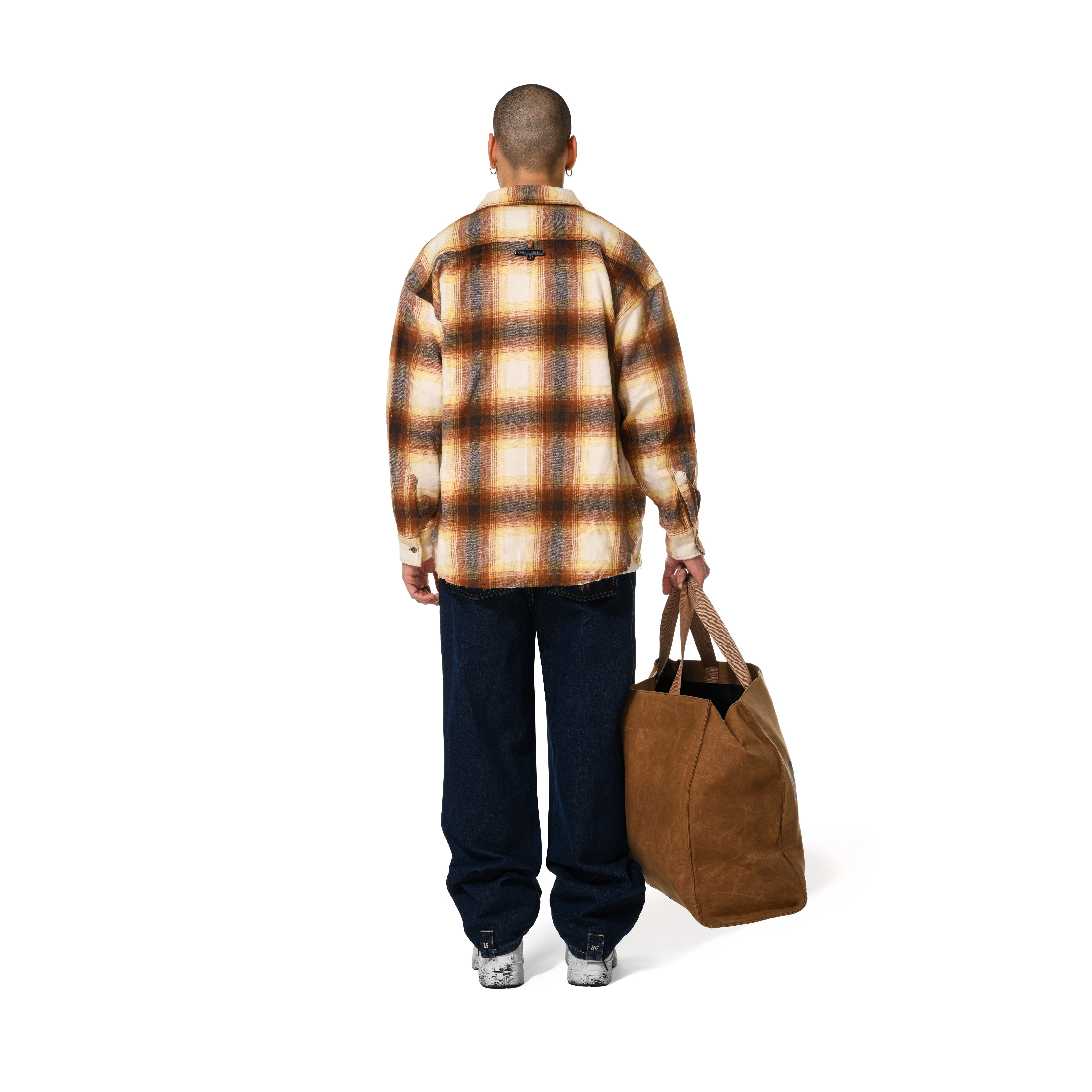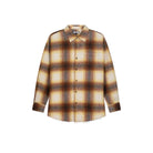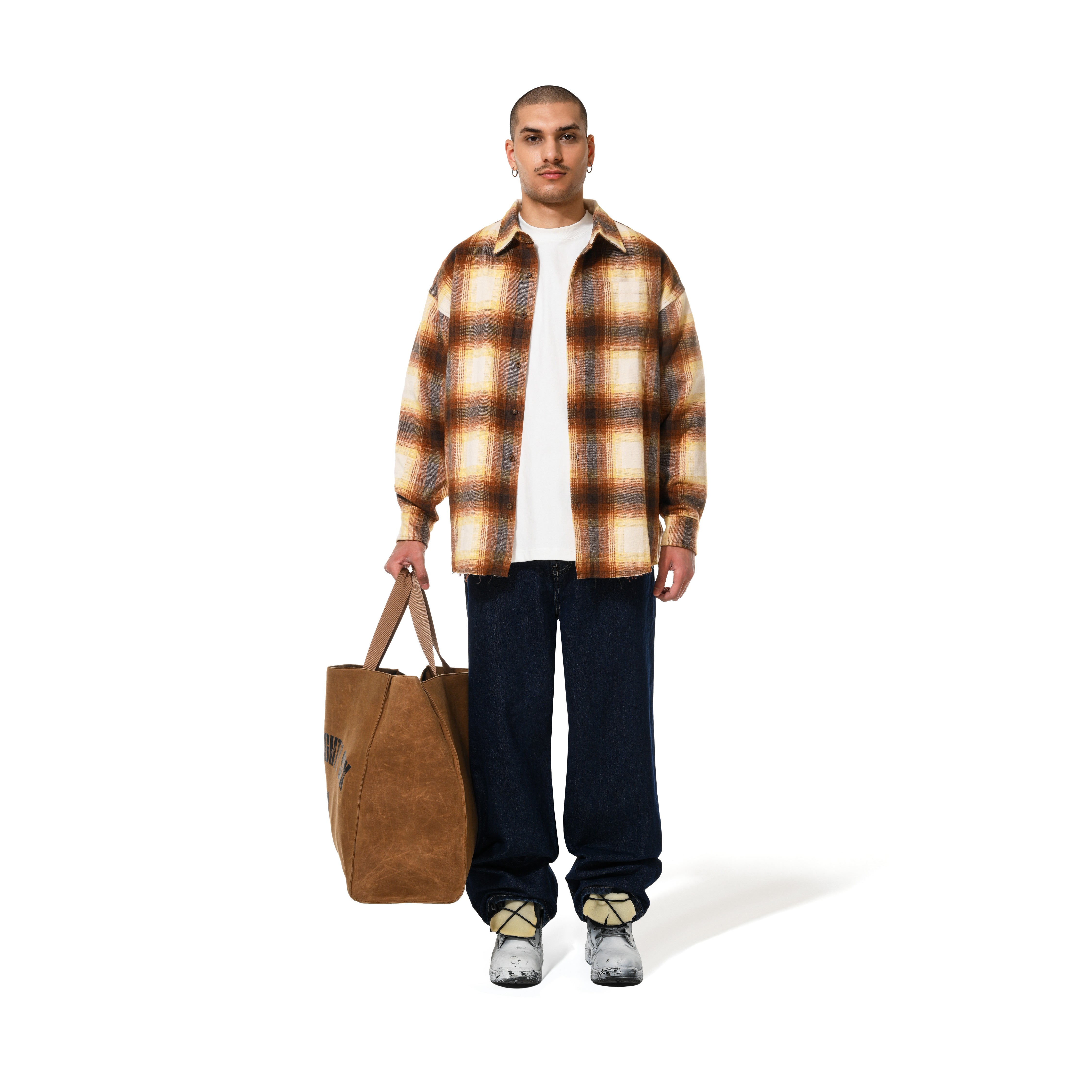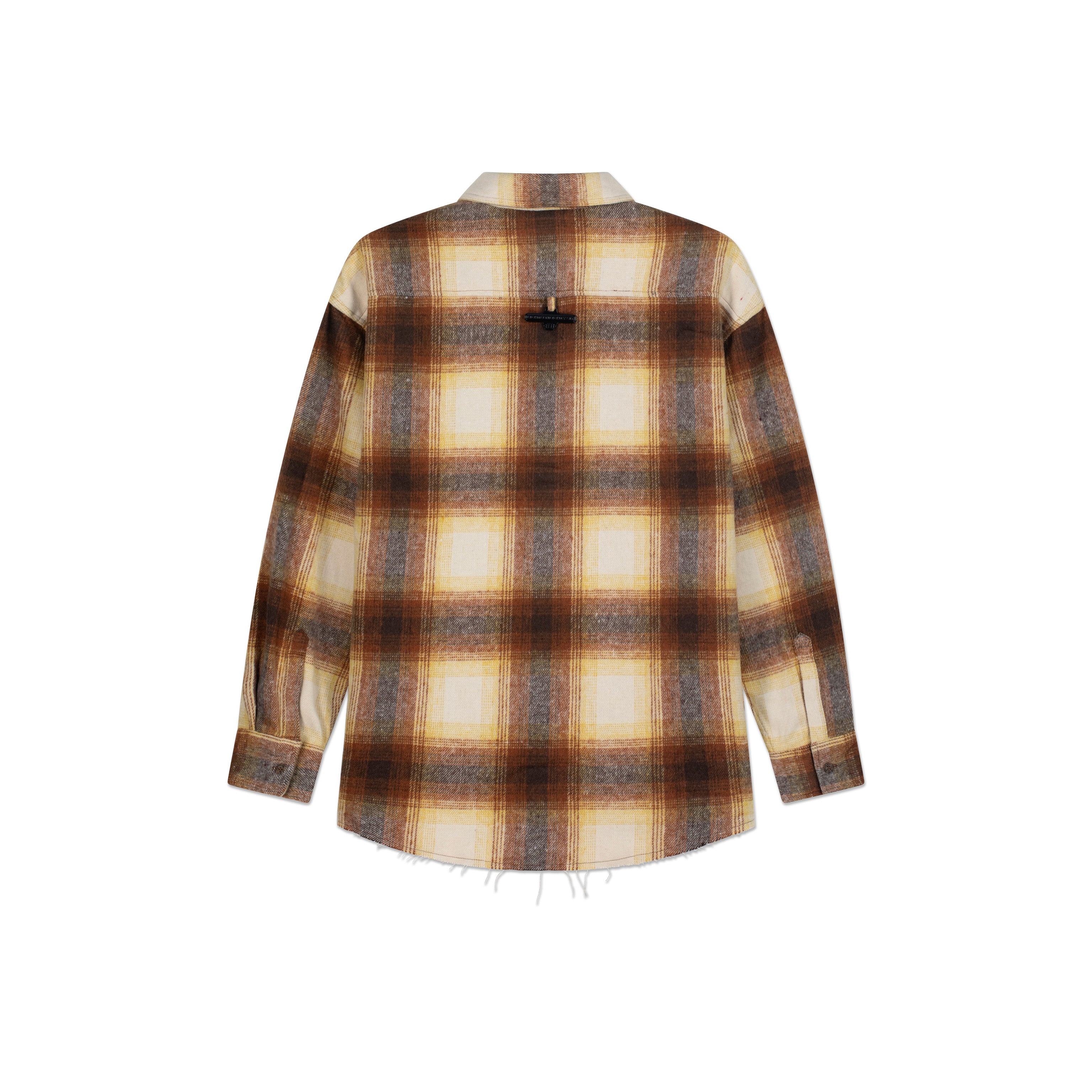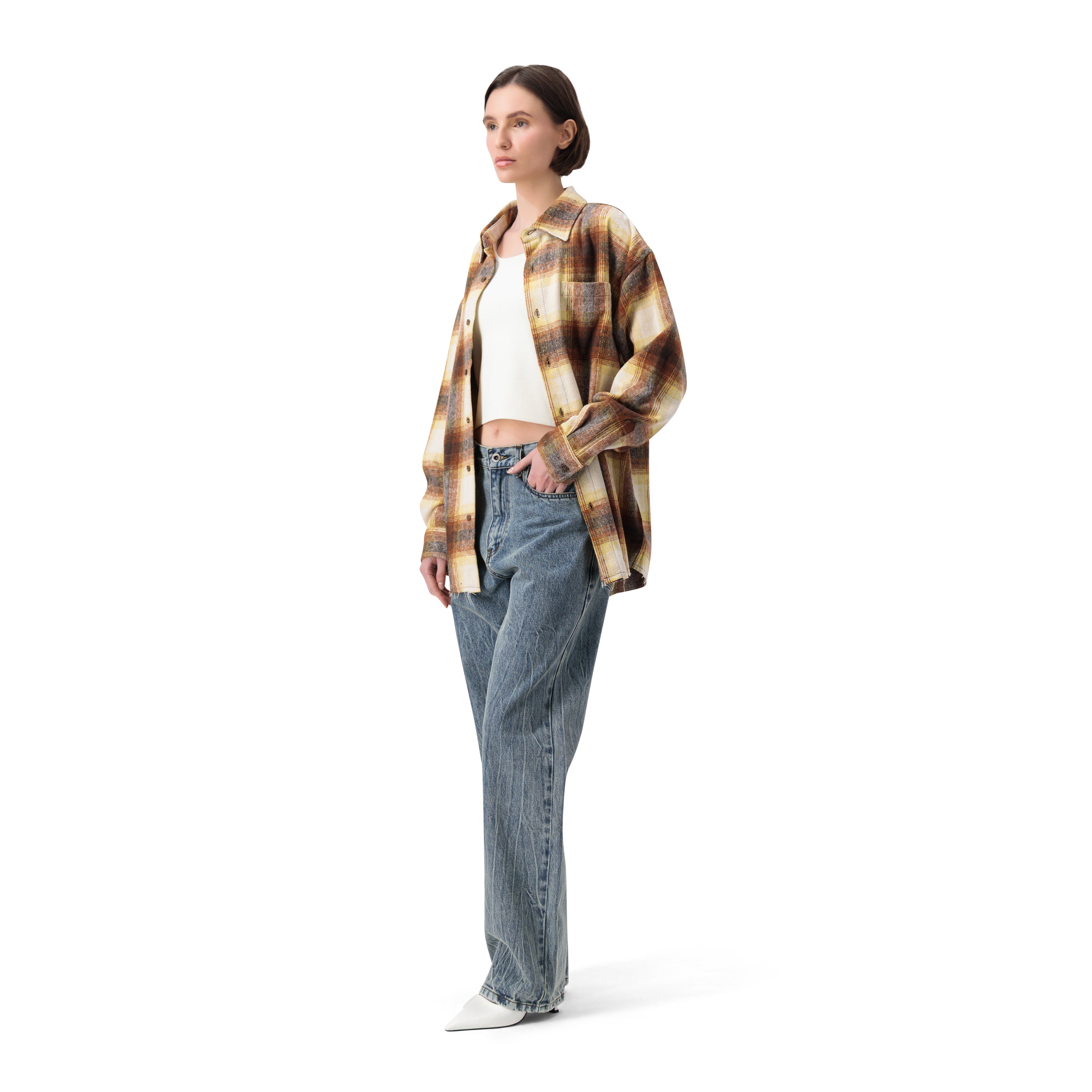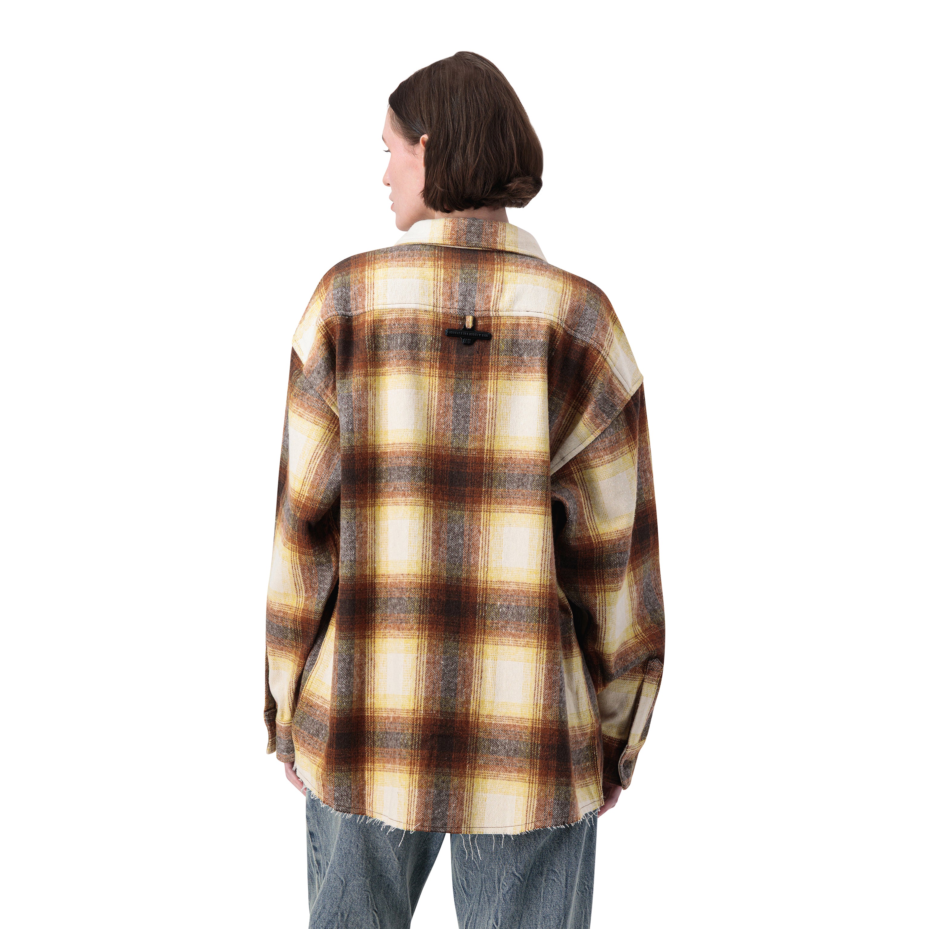 قميص مربعات بأكمام طويلة باللون الأصفر والبني، كبير المقاس، شعار من الفولاذ على الظهر. ياقة كلاسيكية