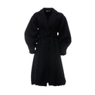 معطف بقصة وسطية كبير الحجم بتصميم شكل الساعة الرملية مع حزام خطاف وأكمام بالون. شعار "Eighteen Eighty Six" مطاطي على الظهر. اللون: أسود. القماش: صوف. يرتدي العارض مقاس M. طول العارضة: 170 سم