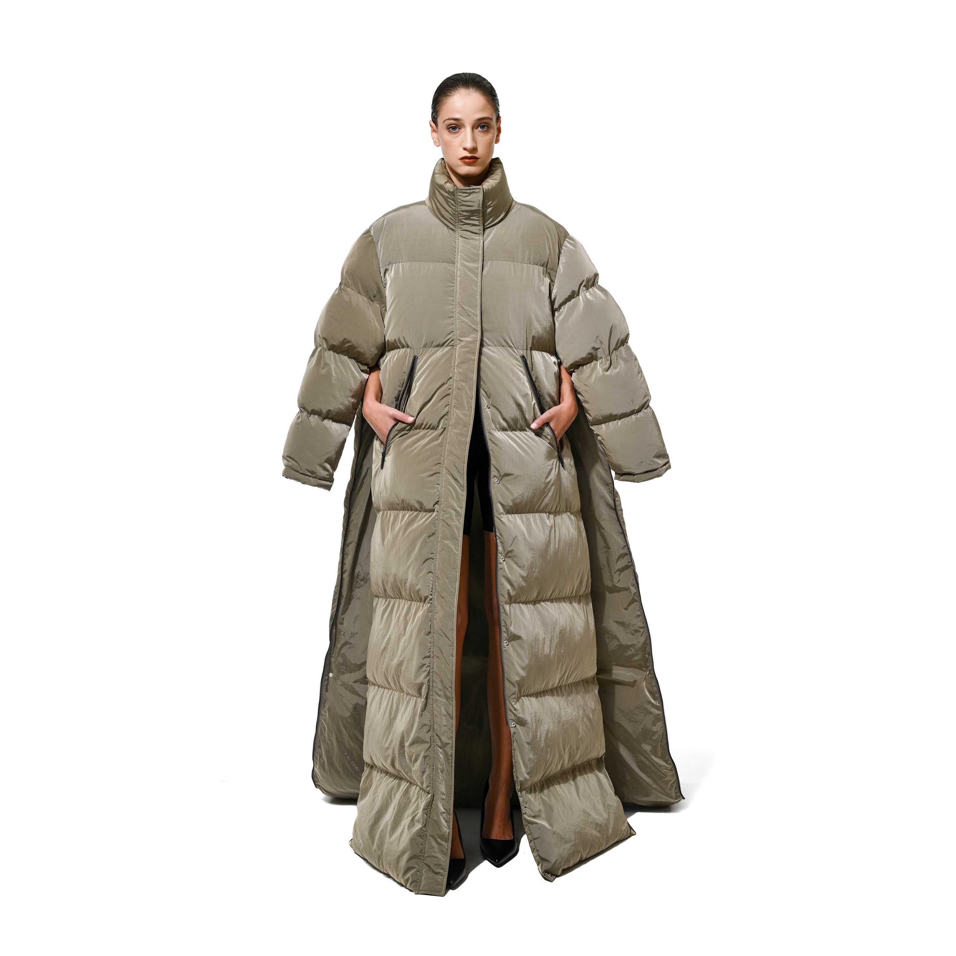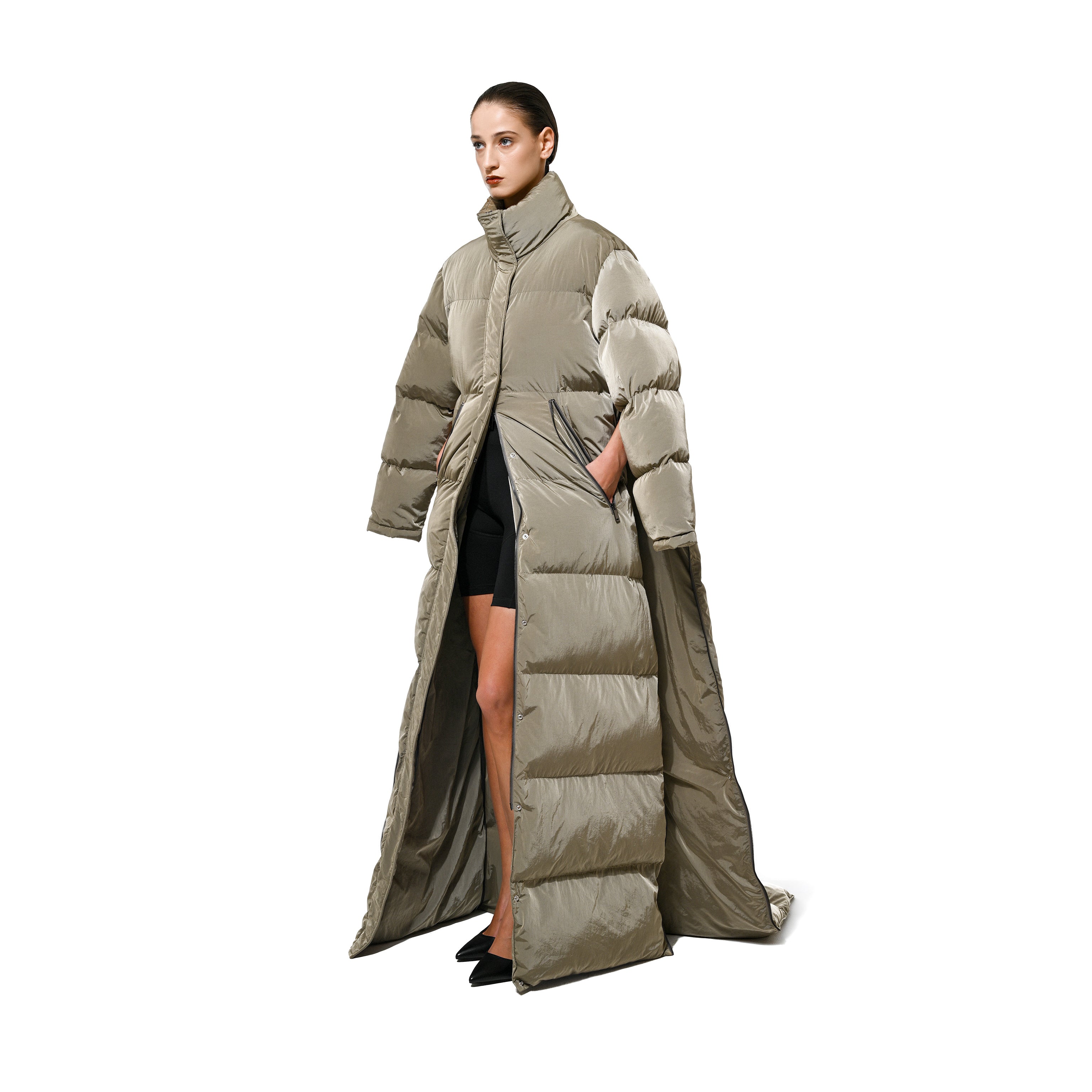 Embrace the ultimate winter statement with this elongated quilted puffer coat, part of the Fall/Winter 2024 womenswear collection. Designed with a floor-length silhouette, this coat offers unparalleled warmth and style. Crafted from water-repellent and wind-resistant nylon, it features a raised puffer collar for extra protection and functionality. Full-length side seam zips create optional slits for ease of movement, while the slanted zip pockets add a practical yet sleek touch.