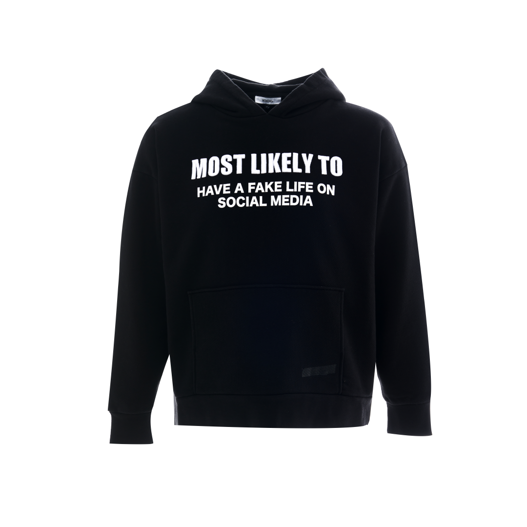 Oversized hoodie with “Most likely tohave a fake life on social media”Graphic printed on the front. ’86 Logoembroidered on the back. Color:Black. Fabric: Cotton 100%