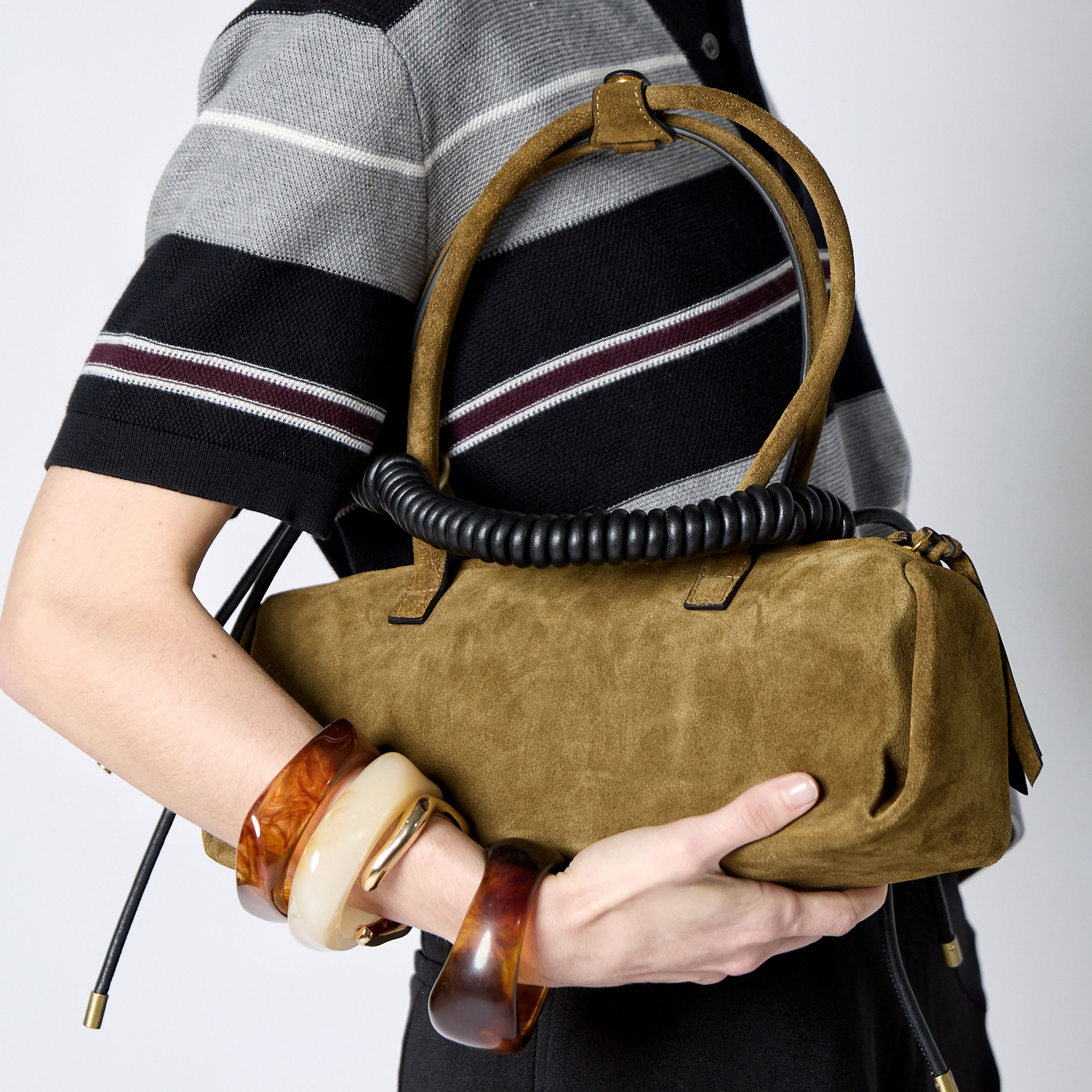 The Courgette Bag is defined by its sculptural silhouette and refined restraint, crafted from supple suede that speaks through texture rather than excess. Designed for modern movement, it balances form and function with effortless sophistication, making it a timeless companion from day to evening.