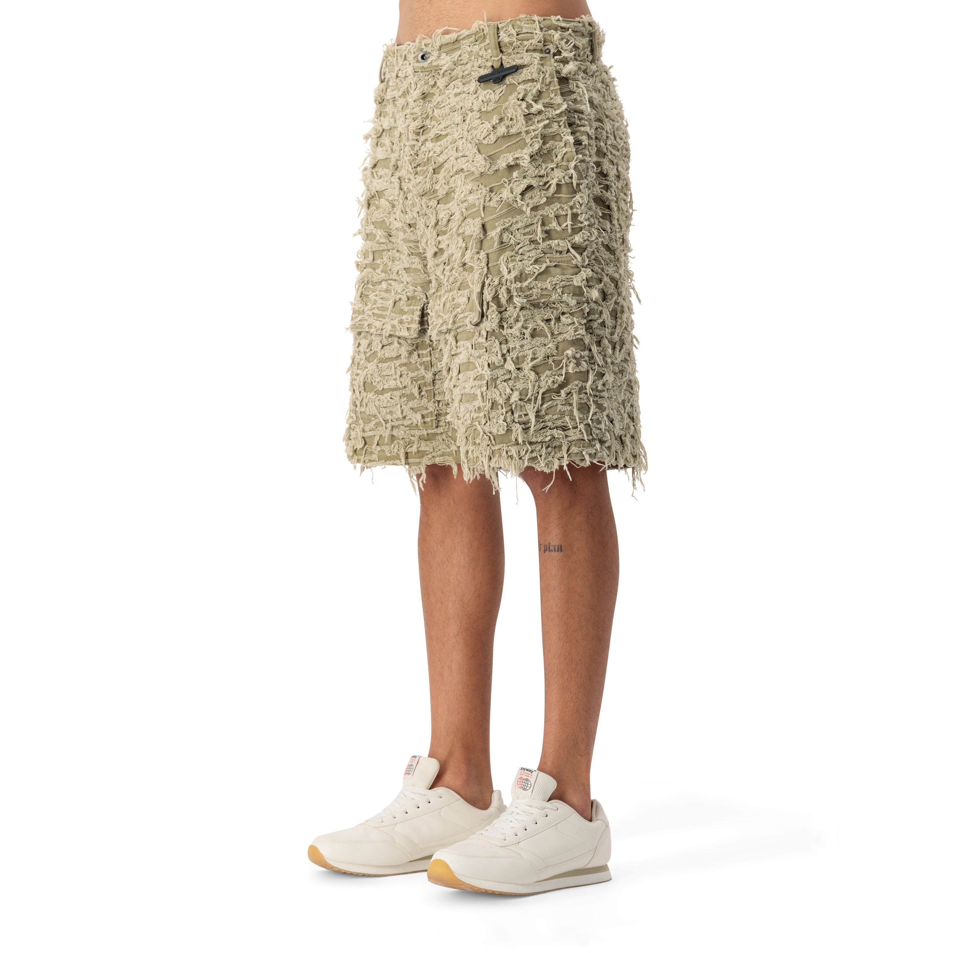 Artisinal textured utility shorts blend rugged style with modern craftsmanship. Featuring a unique distressed loop-knit overlay, they deliver a bold, tactile aesthetic perfect for contemporary streetwear enthusiasts. Designed with functionality in mind, they include multiple cargo-style pockets and a relaxed silhouette for comfort and practicality.