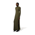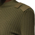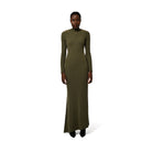 A utilitarian twist on evening wear, this wool rib-knit dress from our Fall/Winter 2024 collection combines elegance with functionality. Designed in an army green hue, it features a half-turtleneck collar, velcro shoulder patches, and a floor-length silhouette with a side slit. The slender fit naturally elongates and flatters, while the patch epaulets add a bold, utility-inspired edge.