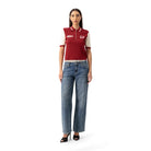 Crafted from a soft, stretchy knit fabric, it guarantees all-day comfort and a perfect fit. The bold red body is contrasted with crisp Off white short sleeves, creating a striking color-block effect.
