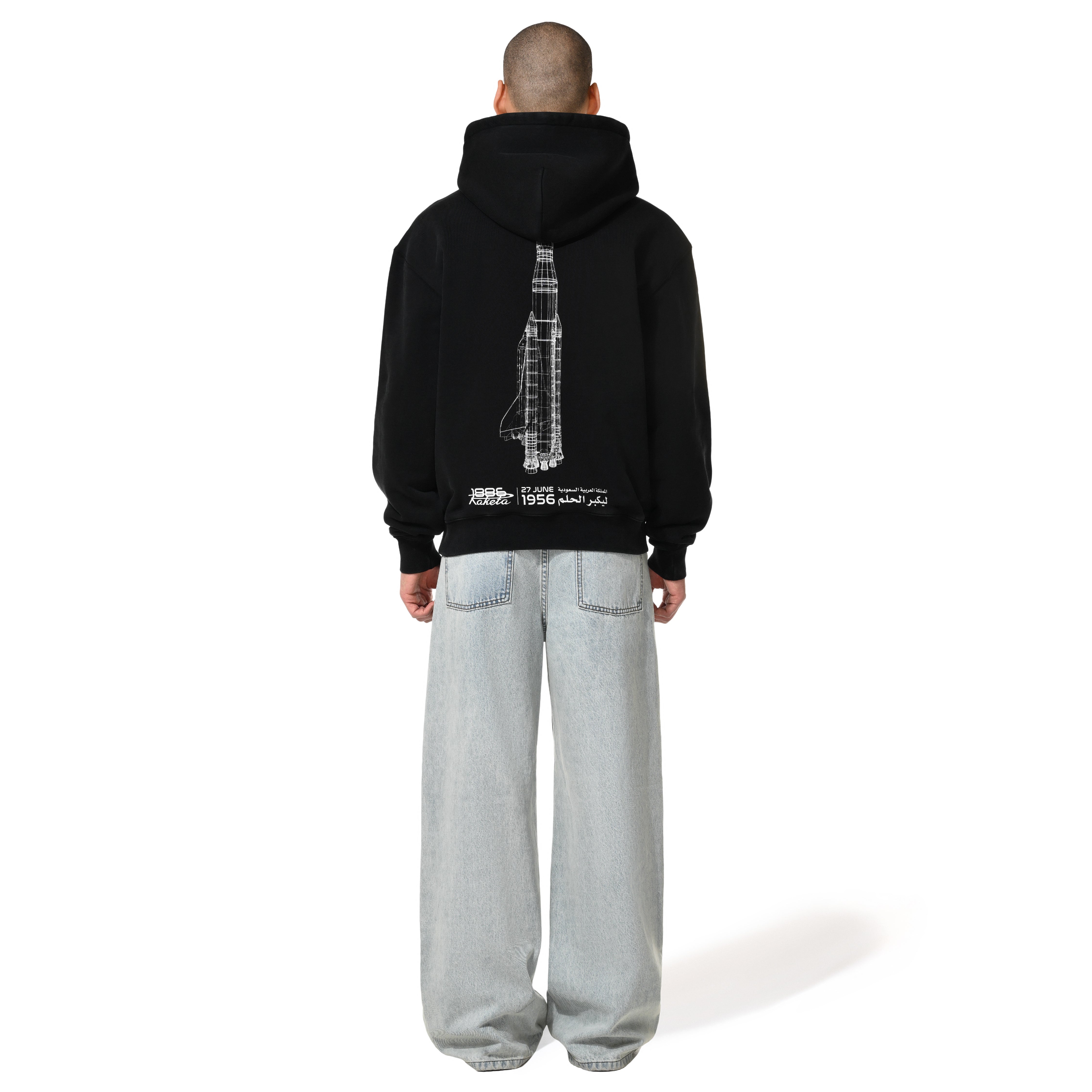 Part of the exclusive 1886 x Raketa collaboration, this unisex hoodie pays tribute to a legacy of ambition and exploration. Featuring a clean front logo print, the standout detail lies on the back—a technical rocket illustration honoring the historic Saudi journey into space on 27 June 1985, with the bold phrase “Let’s Make the Dream Bigger” anchoring the design. With its classic cut and roomy silhouette, this piece bridges archival references with contemporary streetwear.