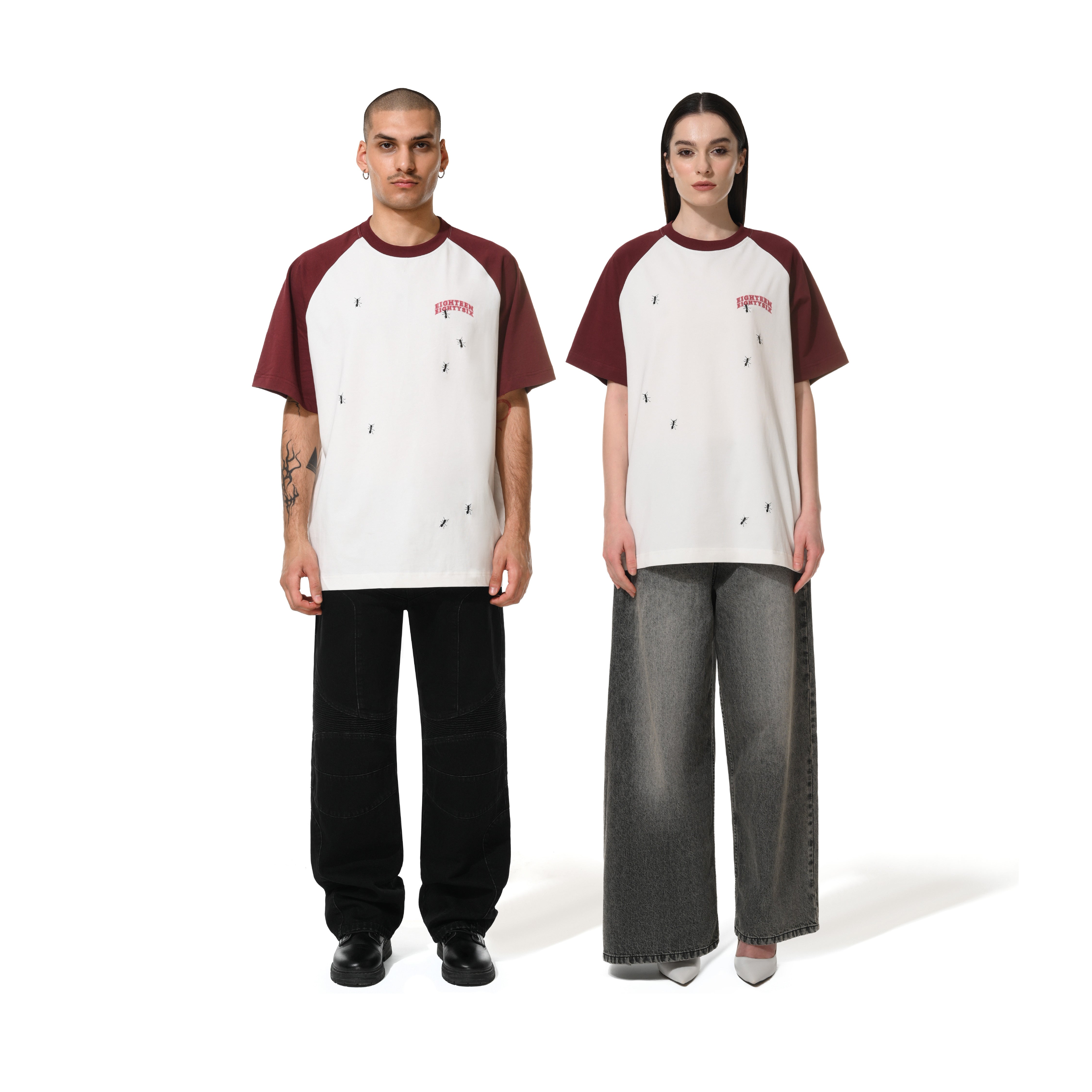 Short sleeves oversized White t-shirt & Maroon shoulders "eighteen eighty six" printed at front . Crew neck colar . "ants" stitched at front & back