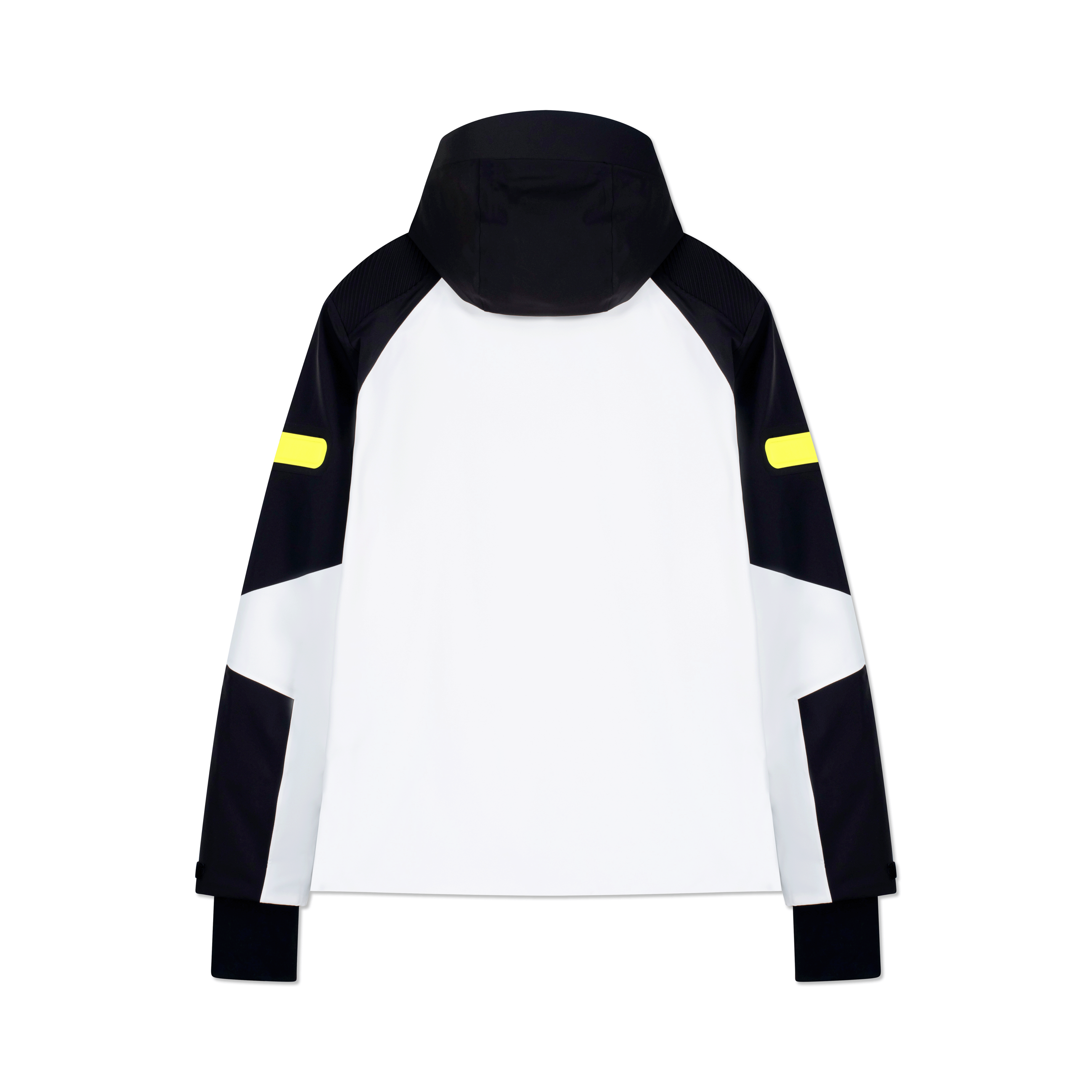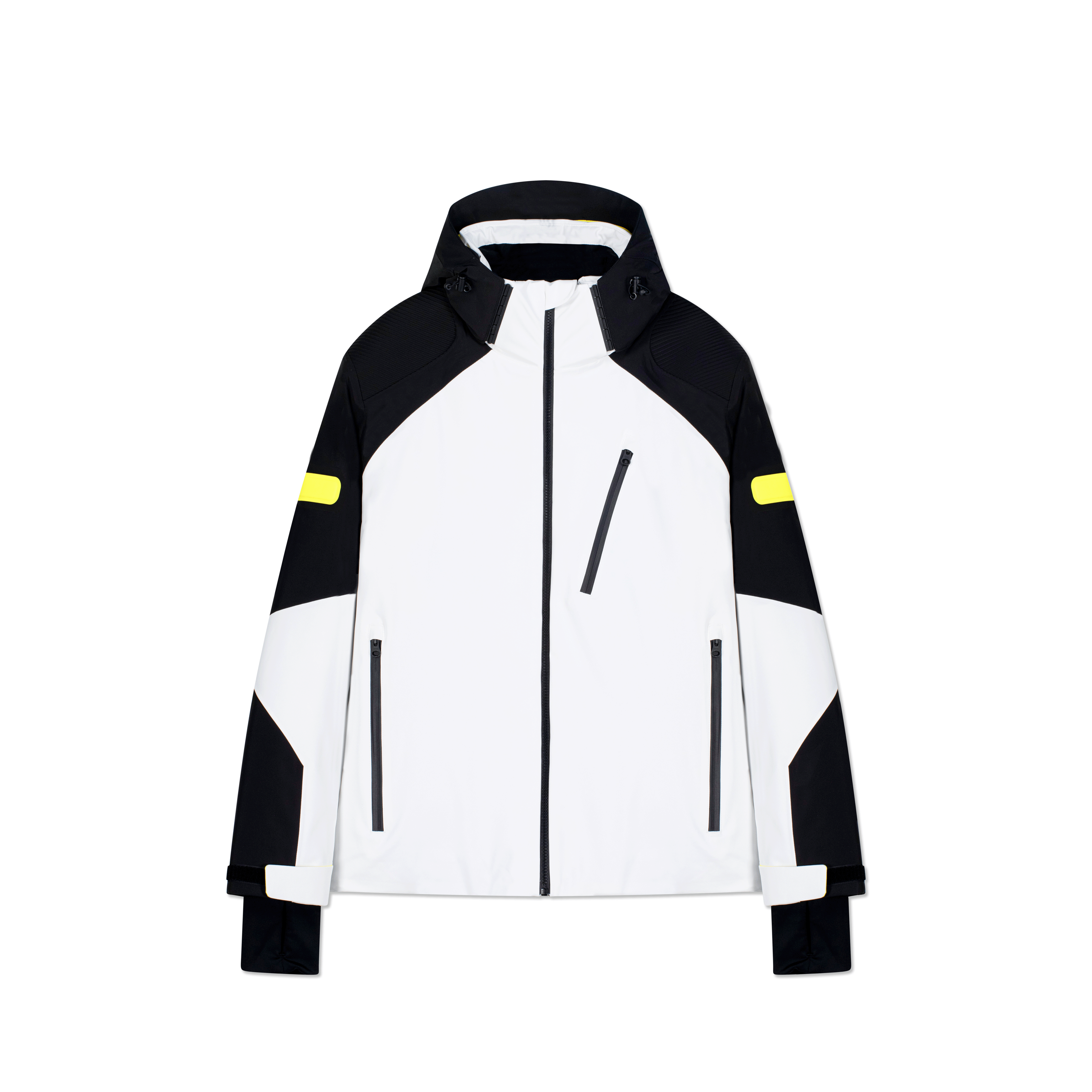 Elevate your cold-weather wardrobe with this performance-driven alpine jacket, engineered for both sleek urban minimalism and high-altitude functionality. Precision-cut paneling in crisp white and deep black creates a striking geometric silhouette, while subtle neon accents deliver a modern, high-visibility edge.