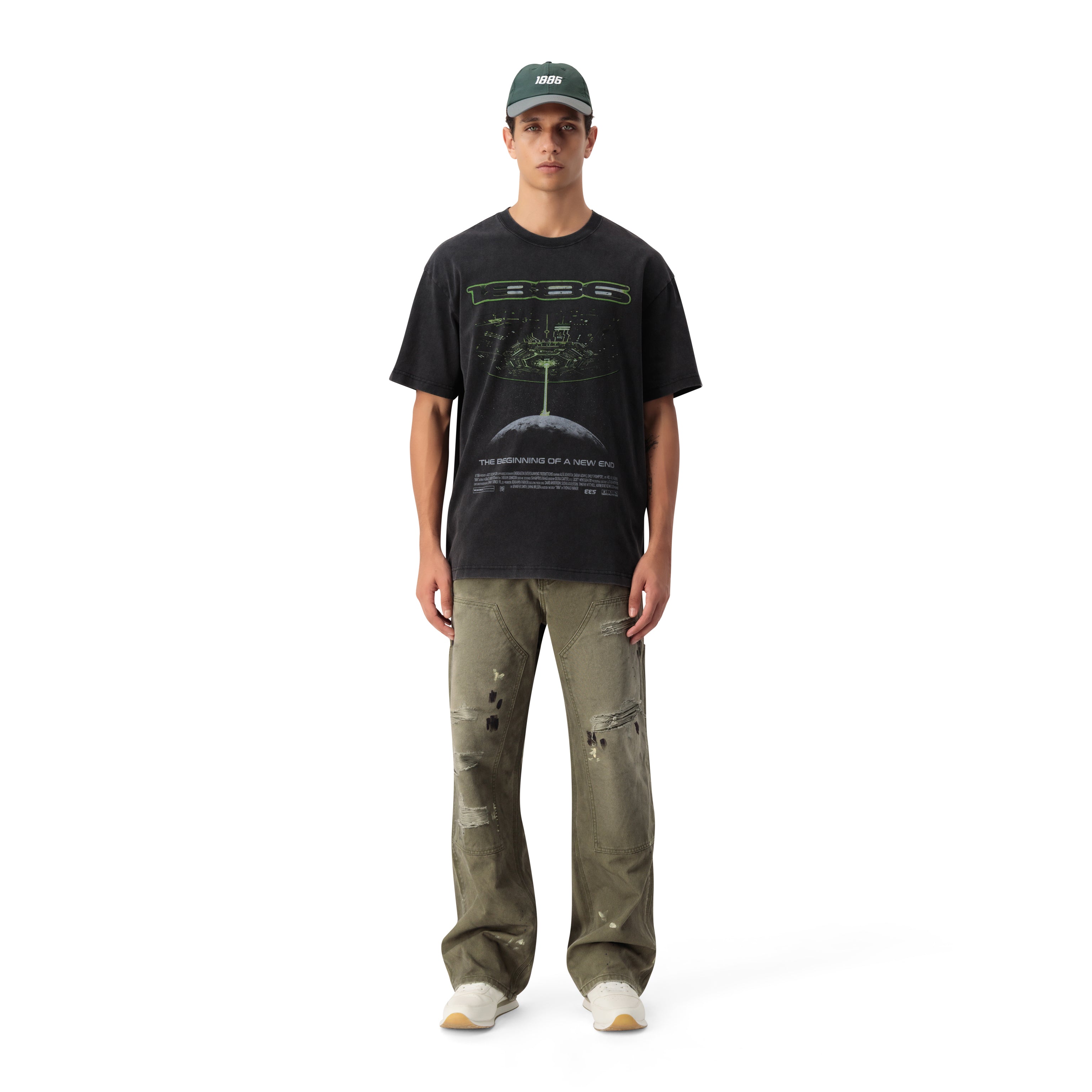 An elevated expression of contemporary streetwear, this 1886 graphic tee merges cinematic futurism with refined minimalism. Crafted on a deep washed-black base, the neon green artwork creates a striking yet controlled contrast — featuring a conceptual sci-fi landscape and the statement “The Beginning of a New End.” Designed with intention, this piece balances bold visual identity with understated luxury.