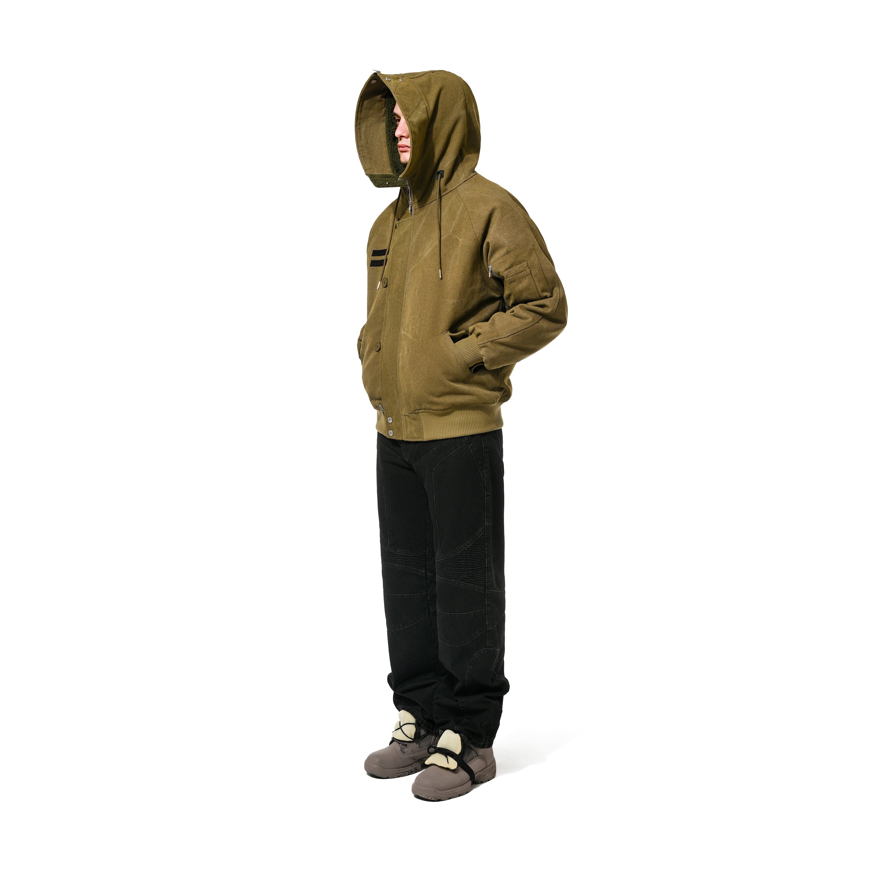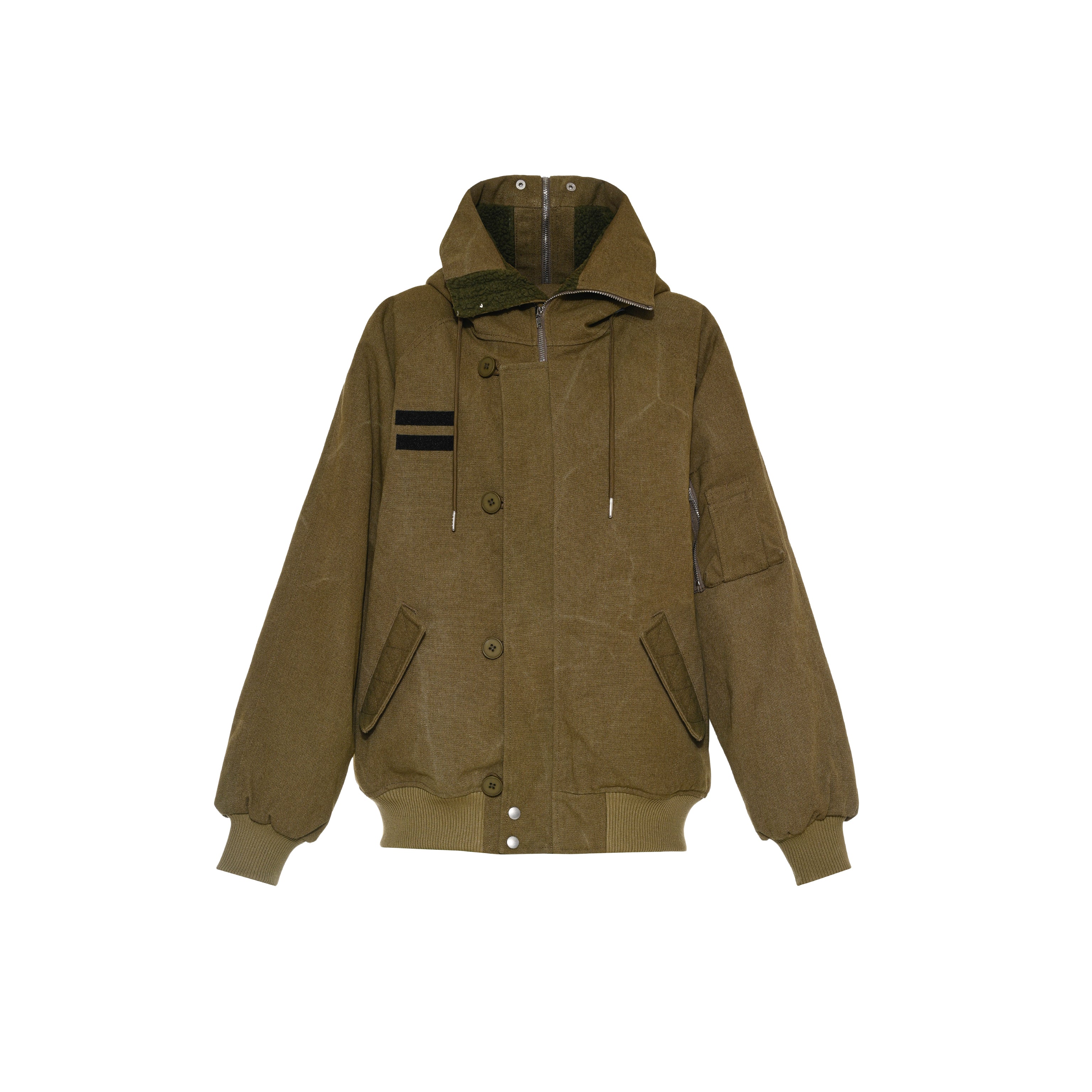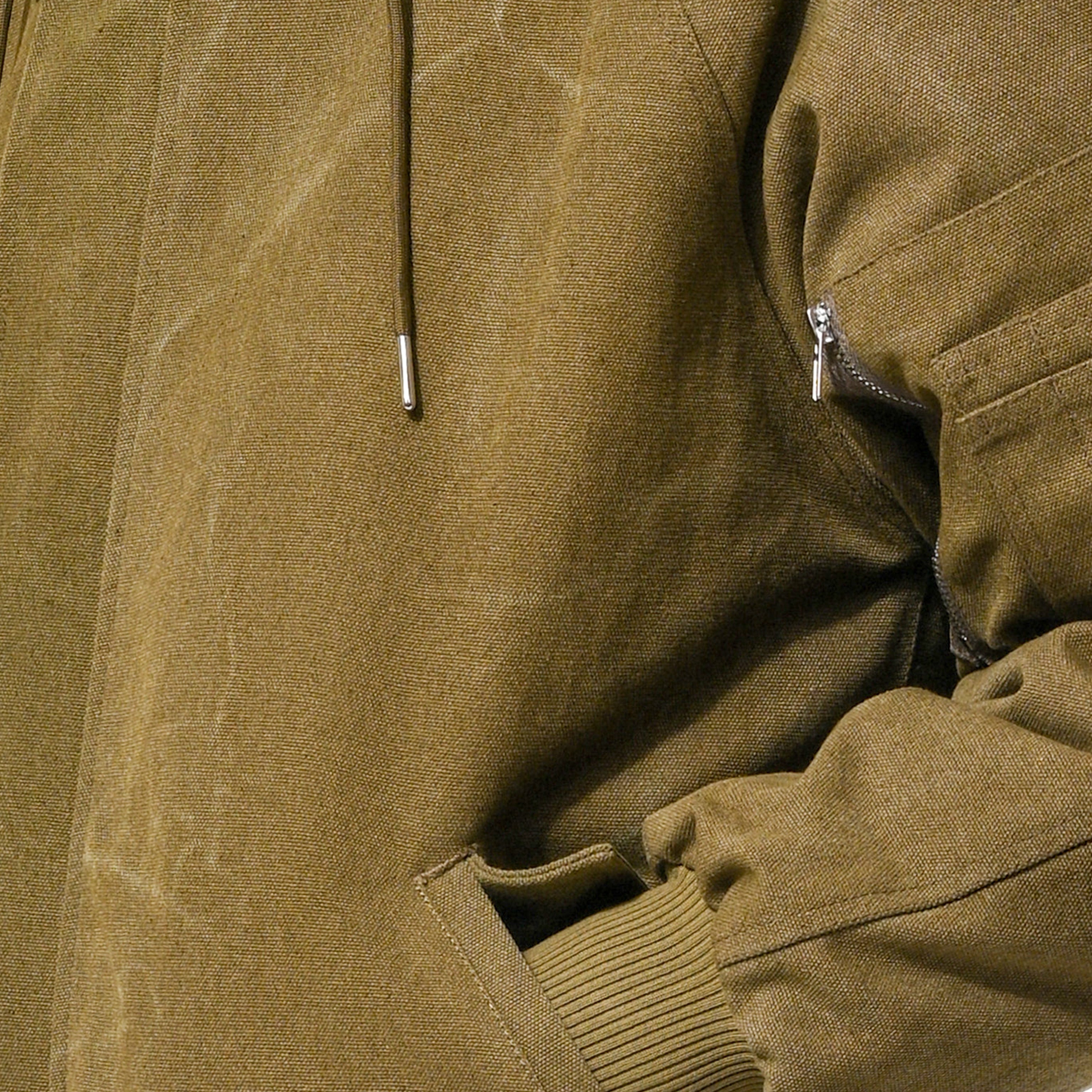 A versatile fusion of utility and style, this bomber jacket is crafted from durable canvas with subtle distressed detailing for a modern, utilitarian edge. Featuring a regular fit, it is designed with a 2-way zipper closure and a zipped hood with eyelet button details for added functionality.