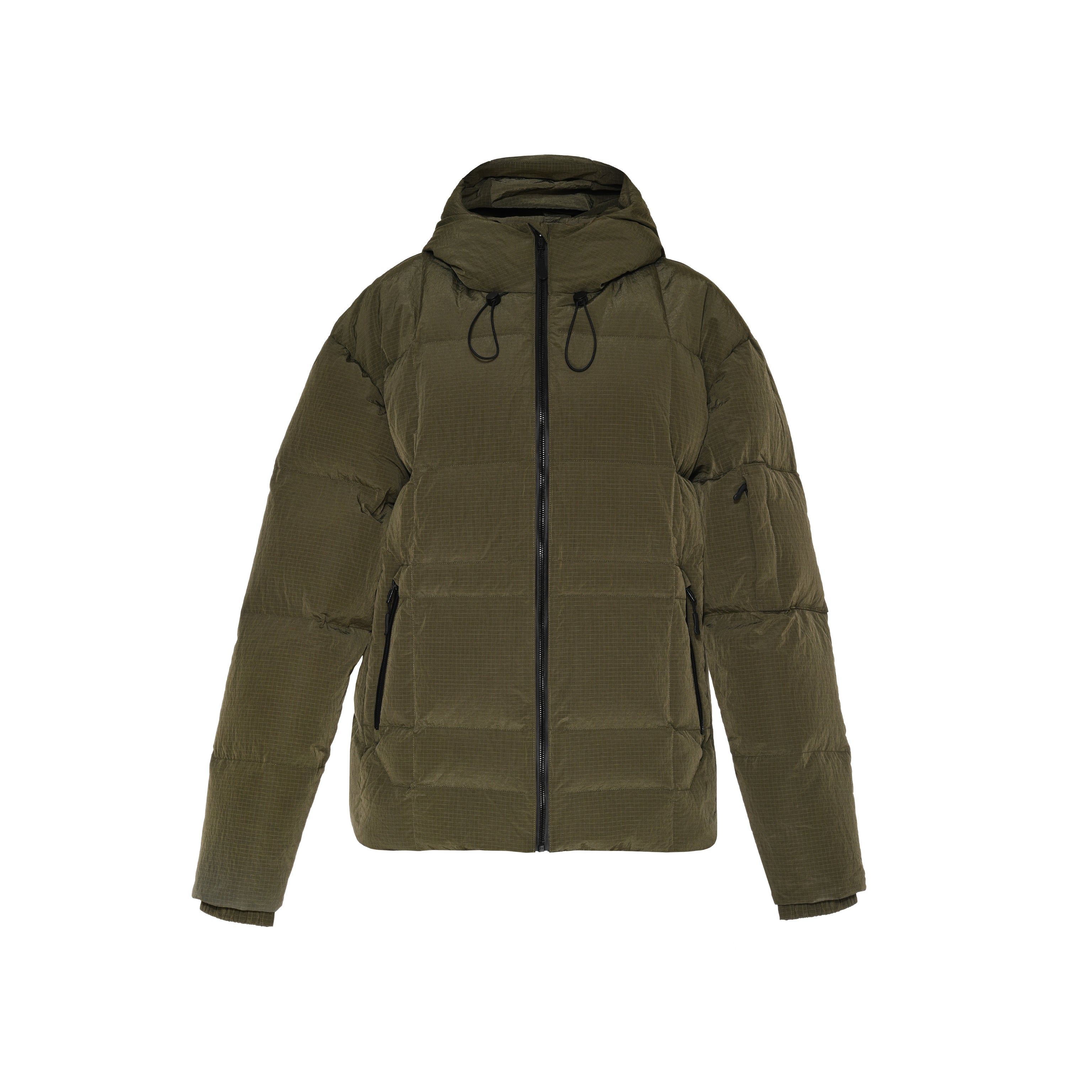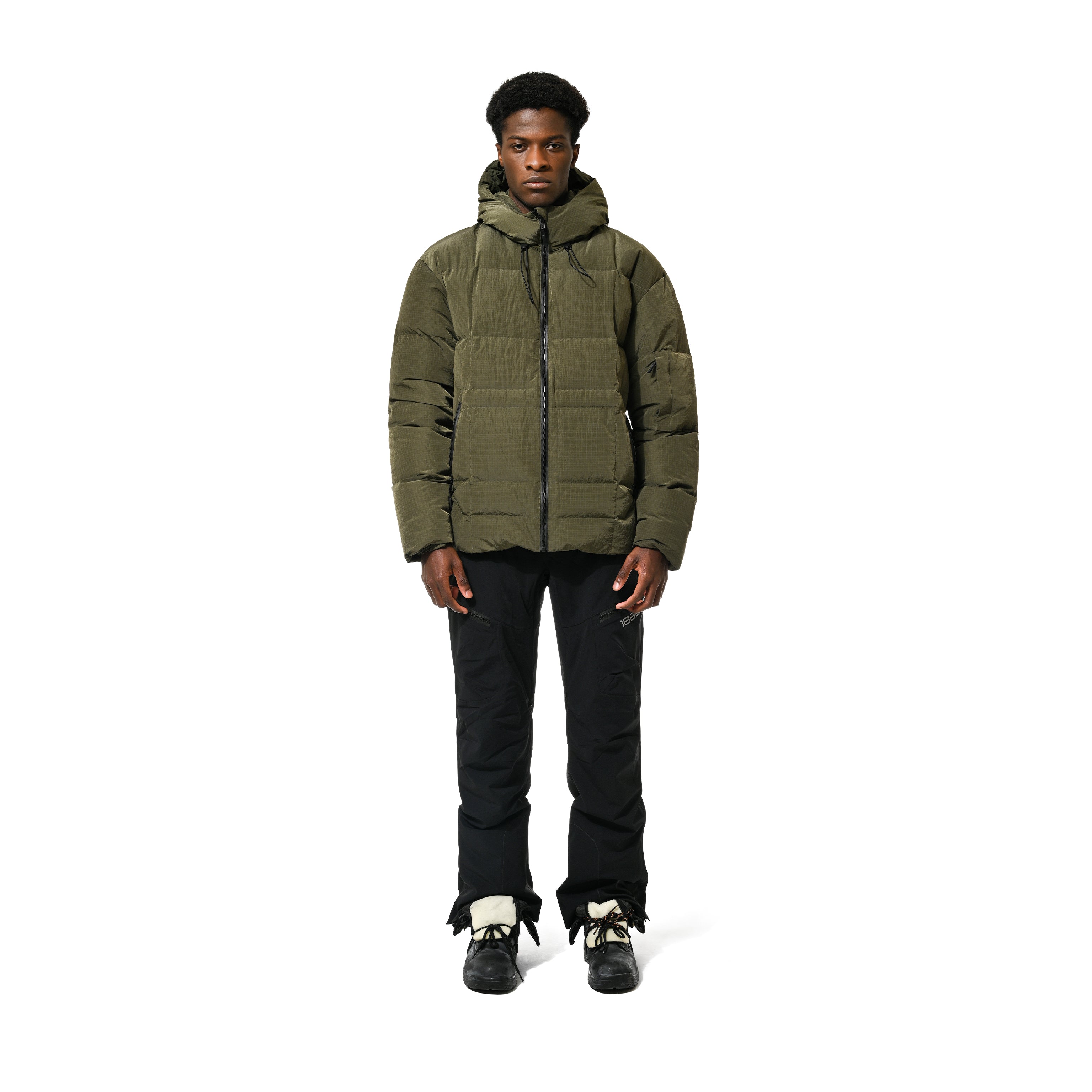 Designed for optimal performance and style, this men’s puffer ski jacket from our Fall/Winter 2024 collection is built to withstand extreme cold with ease. Crafted from water-repellent ripstop nylon, it features duck down filling for exceptional warmth. The high-neck hood, curved sleeves, and internal weather protection system make it ideal for winter adventures. Adjustable pull tabs, internal shoulder straps, and a silicone waistband ensure functionality and comfort.