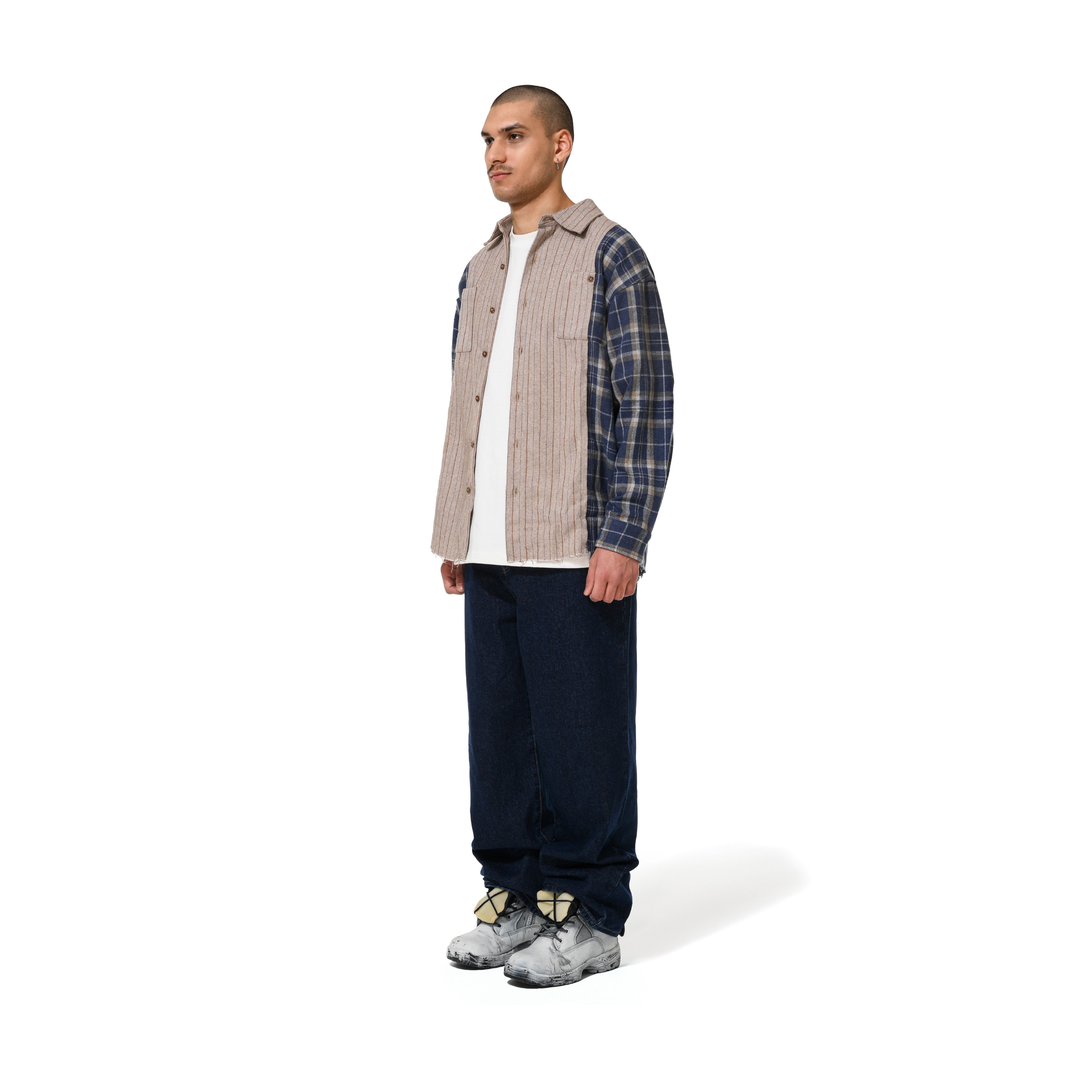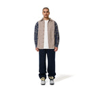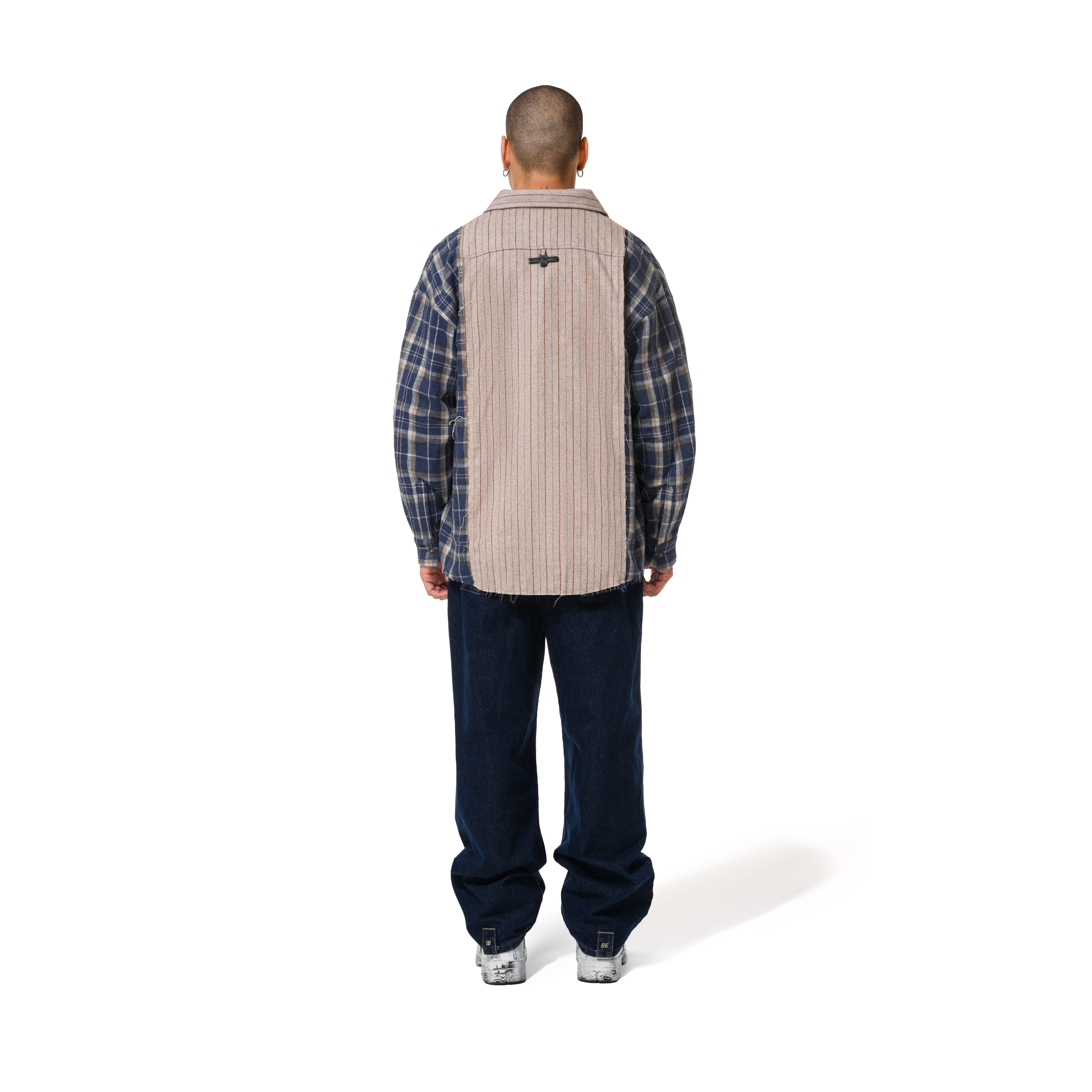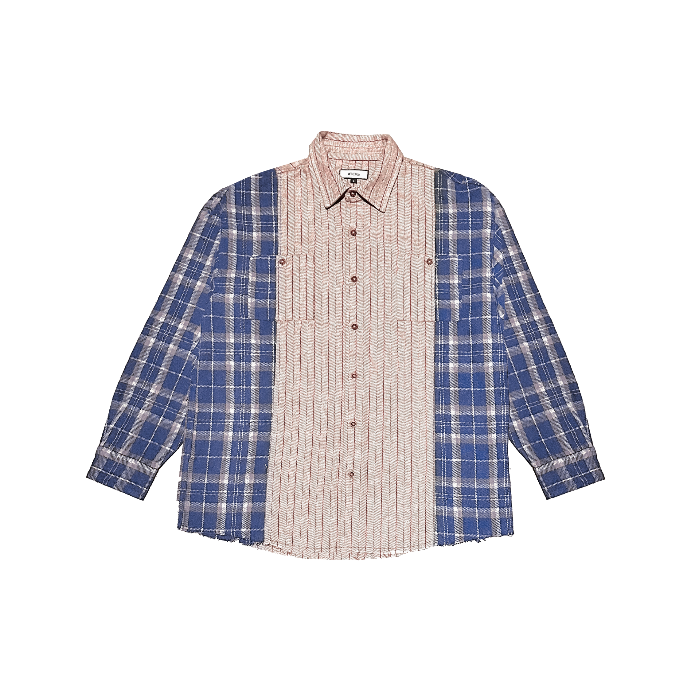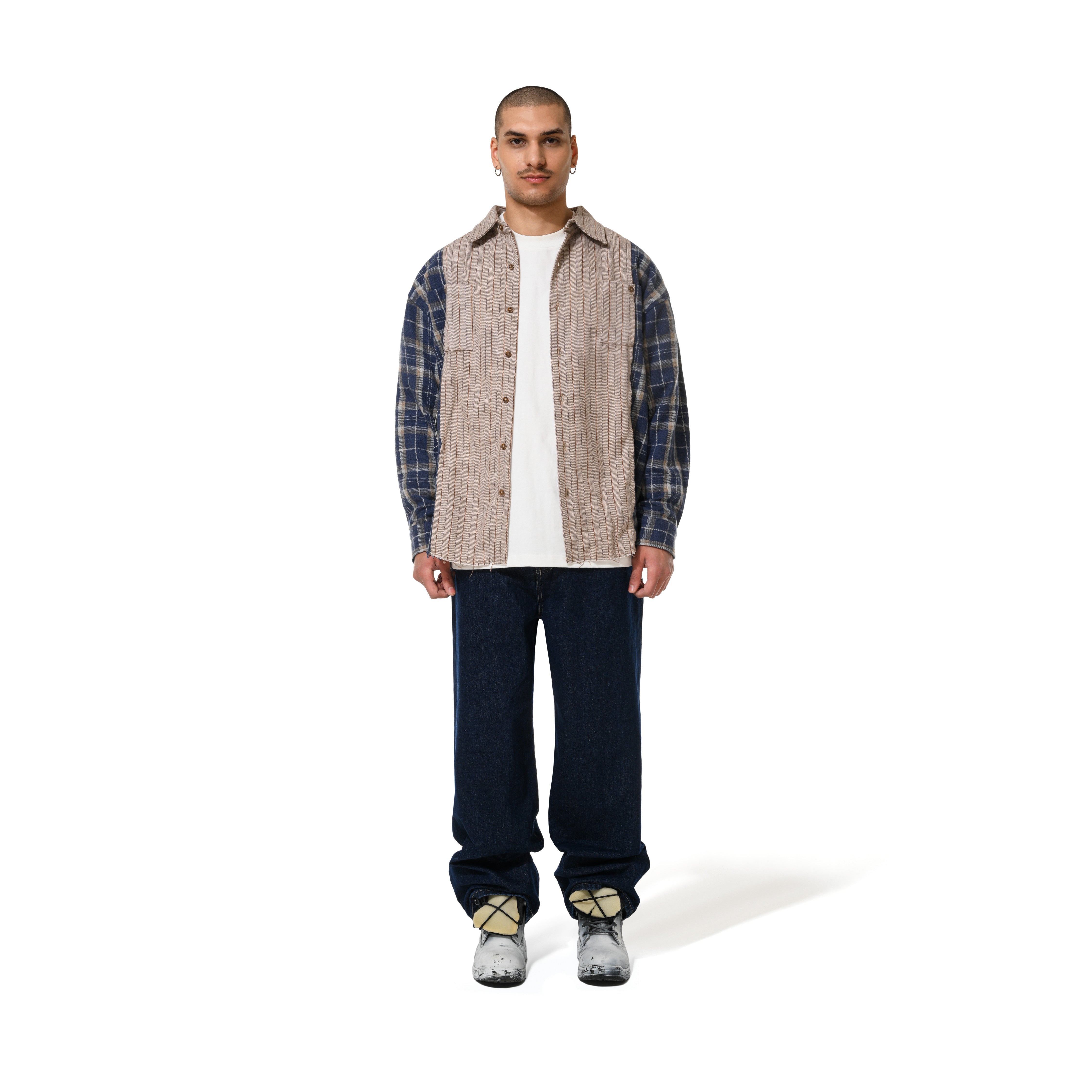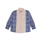 Beige & Blue Long sleeve Oversized Check shirt, Steel Badge Logo At Back. Classic Collar