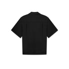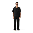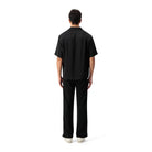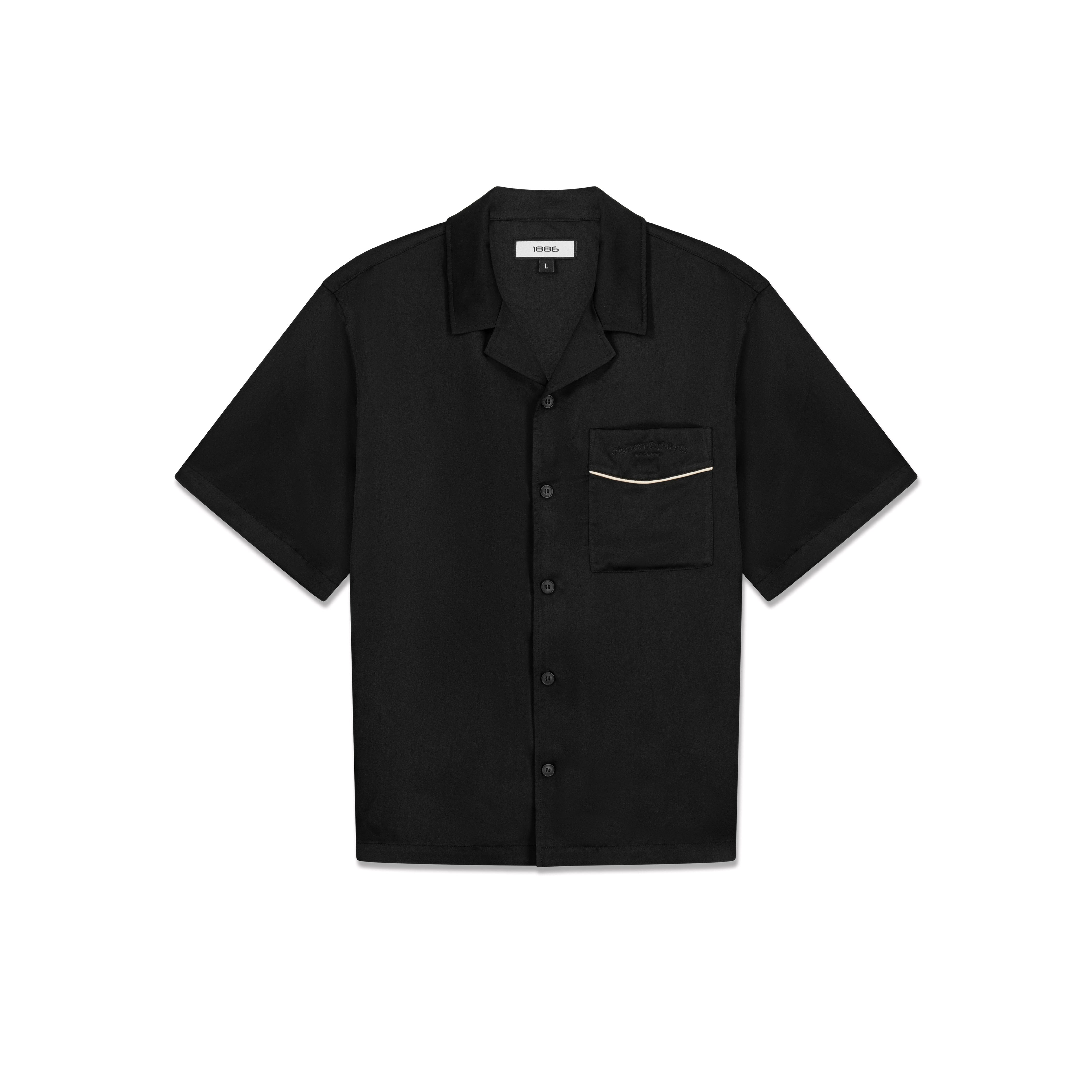 Black shirt ، Camp collar Short sleeves ، Button-up front • Chest patch pocket with white piping.