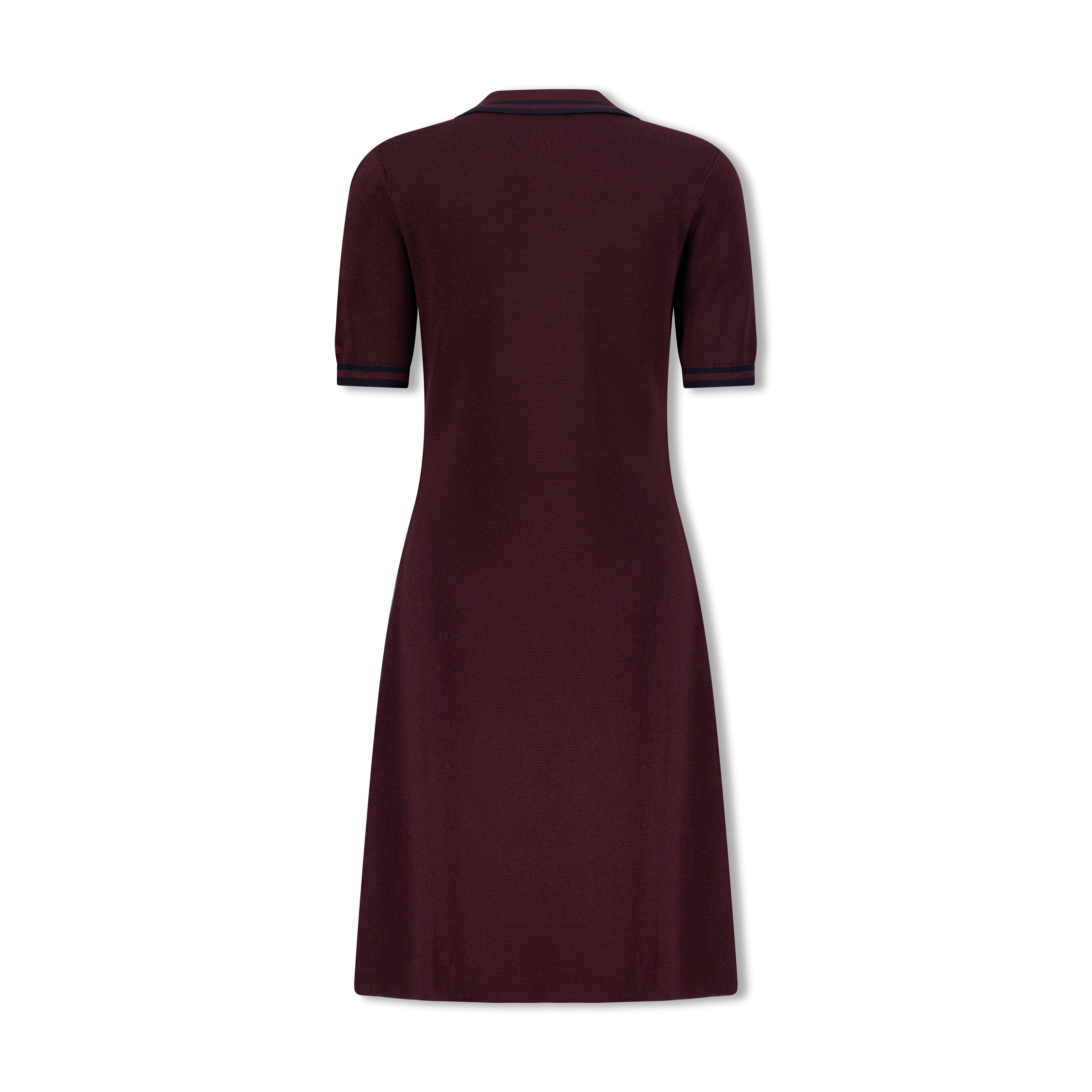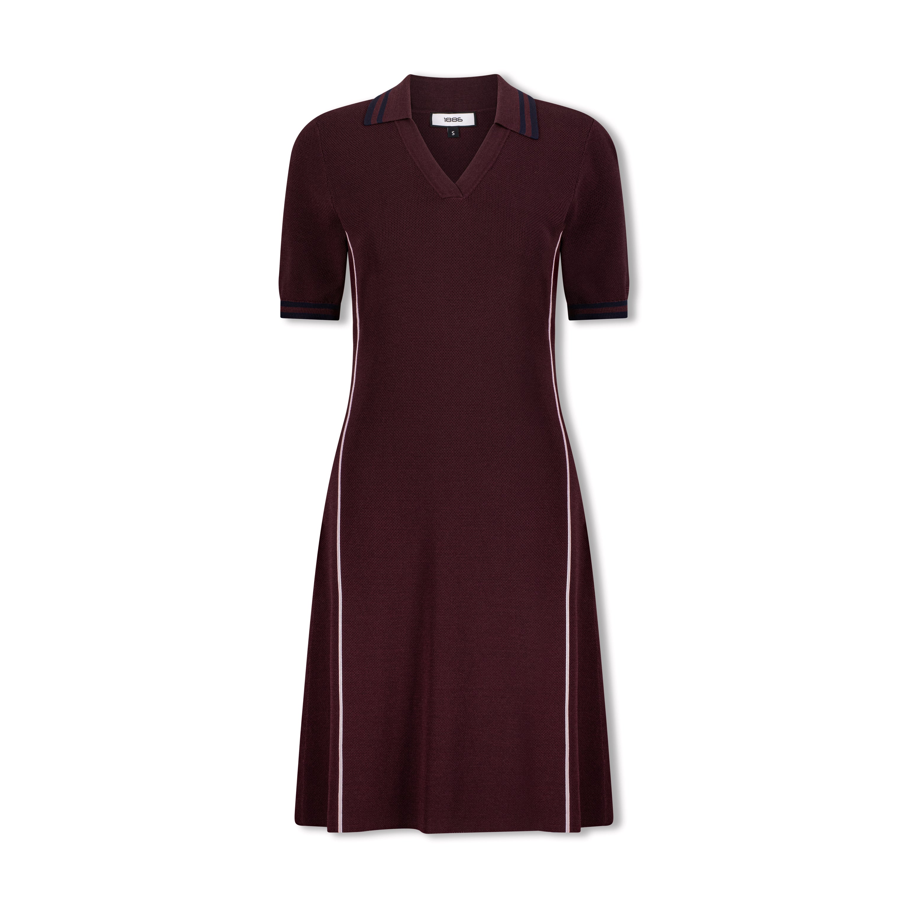 The rich, elegant burgundy color complements all skin tones. For a modern, the dress is adorned with sleek white stripes running down each side, creating a flattering vertical line and adding a vibrant touch to the design.